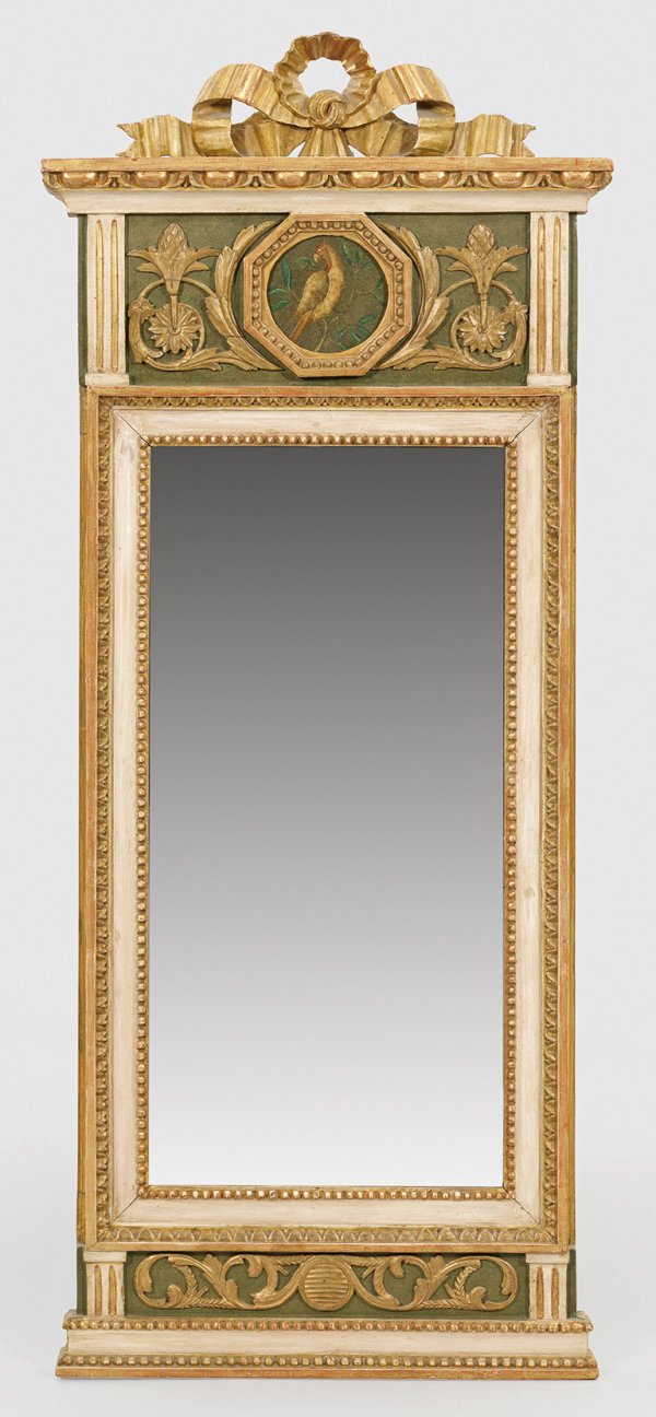 Holz, geschnitzt, elfenbeinfarben und grau-grün gefasst sowie teilw. vergoldet. Hochrechteckige, profilierte Spiegelrahmung aus Perlstab. Im Giebelfeld oktogonales Medaillon mit polychromer Papageiendarstellung, flankiert von üppigen Blattvoluten. Durchbrochen gearbeitete Schleifenbekrönung. Altes Spiegelglas. 132 cm x 55 cm.