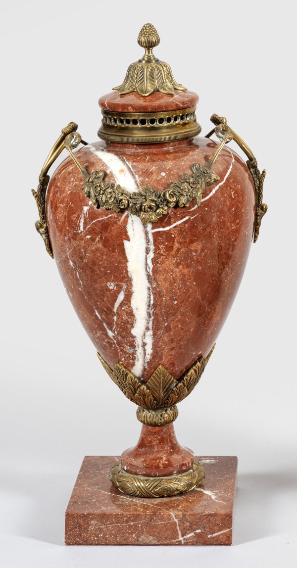 Rotbrauner, weiß-grau gemaserter Marmor und Bronze. Über quadratischer Plinthe balusterförmiger Korpus mit Fries aus erhaben reliefierten Lanzettblättern. Seitlich schlanke Volutenhenkel, durch reliefplastische Blütenfestons verbunden. Geschweift ansteigender oberer Abschluss. H. 56 cm.