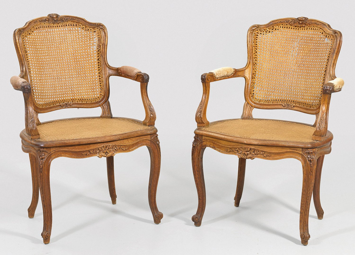 A pair of oakwood Louis XV armchairs. Later additions.