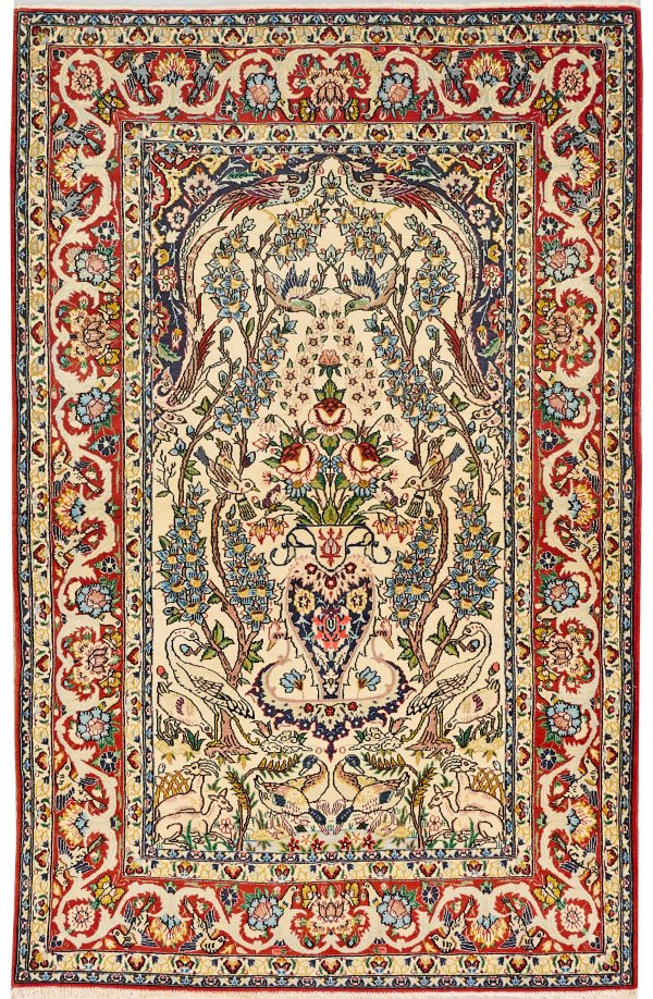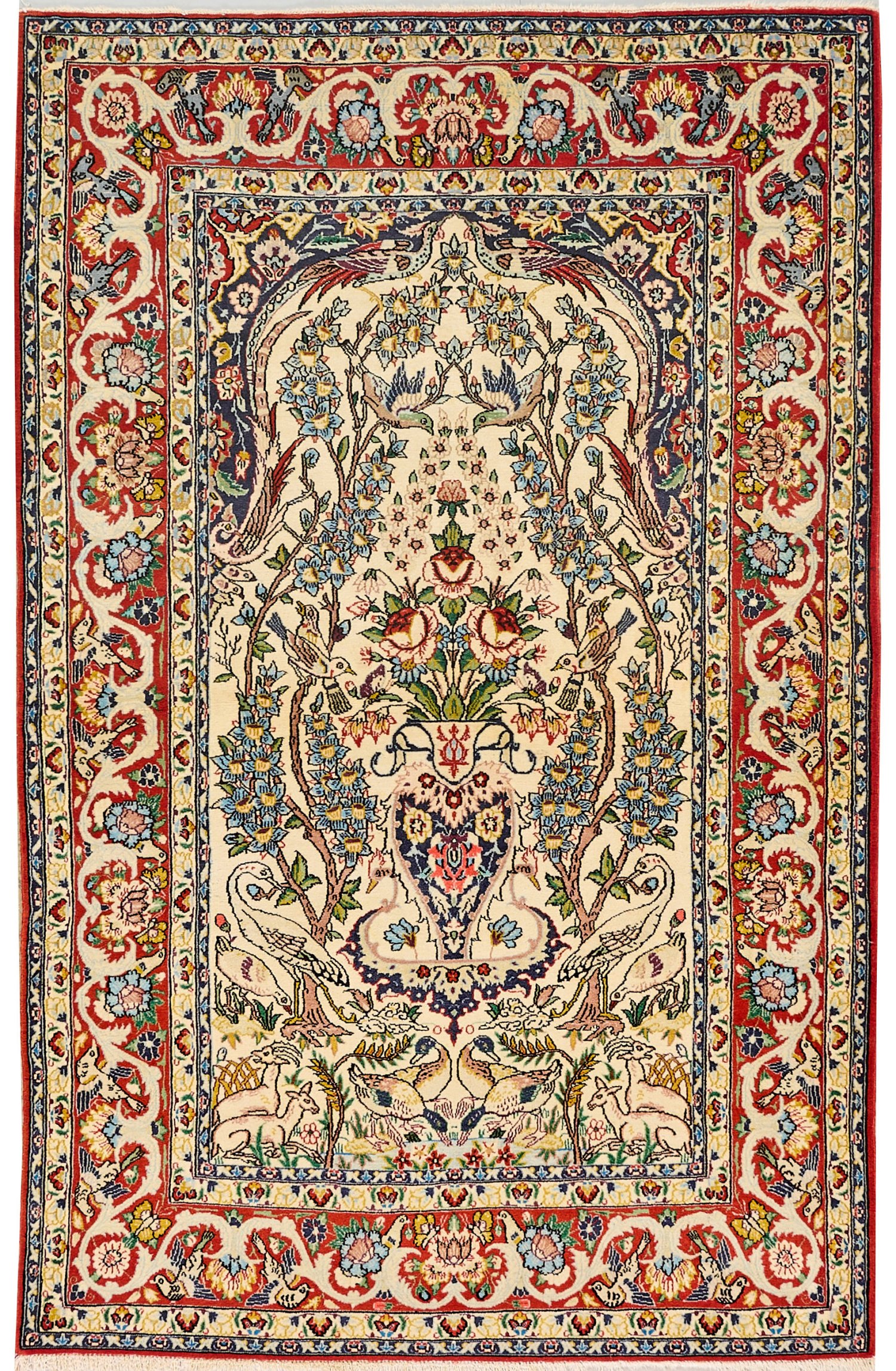 Persien. Korkwolle auf Baumwolle. Im elfenbeinfarbenen Innenfeld passig geschweifte Nische mit großem Vasenmotiv sowie flächendeckender Musterung aus großen Blütenrispen und unterschiedlichen Wildtieren. Umlaufend breite, rotgrundige Bordüre aus Arabesken. 163 cm x 108 cm.