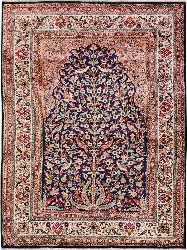 Türkei. Mercerisierte Baumwolle auf Baumwolle. Im dunkelblauen Innenfeld passig geschweifte Nische mit flächendeckendem Rankenmuster und Vögeln. Umlaufend breite, mehrteilige Bordüre auf elfenbeinfarbenem Grund. 158 cm x 118 cm.