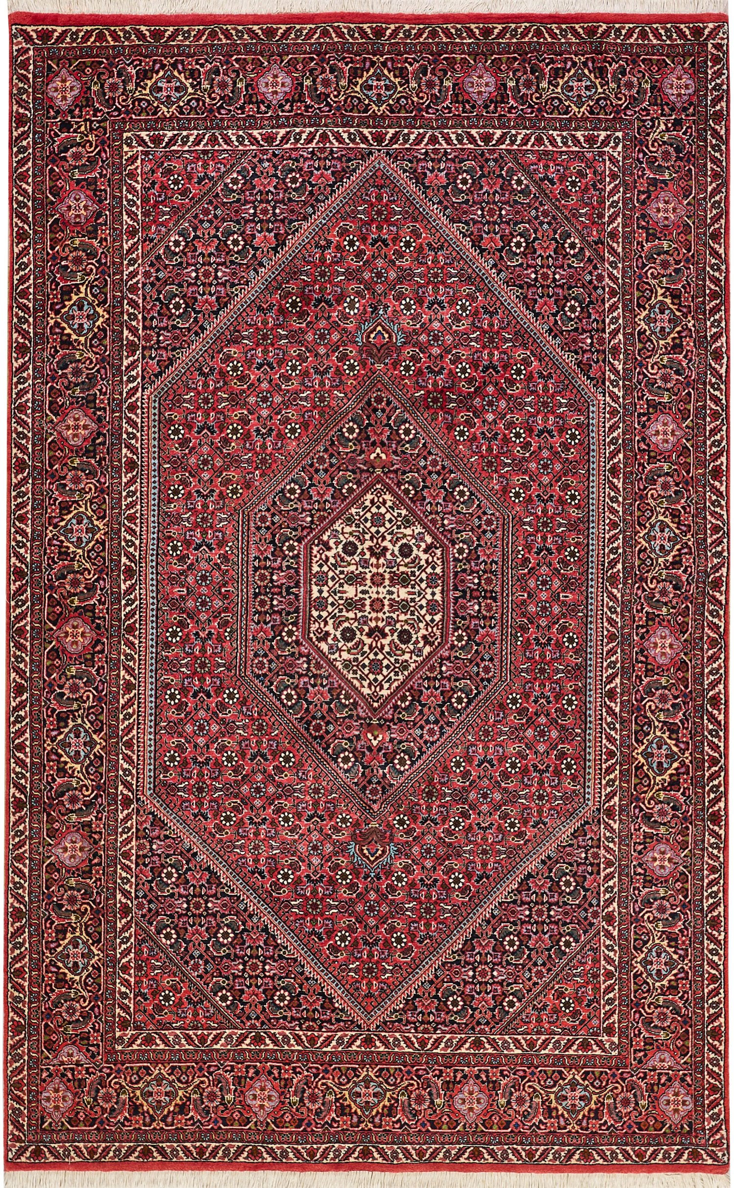 Persien. Korkwolle auf Baumwolle. Feine Knüpfung. Auf hellrotem Fond gestaffelt angeordnete Rautenmotive sowie flächendeckende Herati-Musterung. Umlaufend breite, korrespondierende Bordüre. 215 cm x 130 cm.