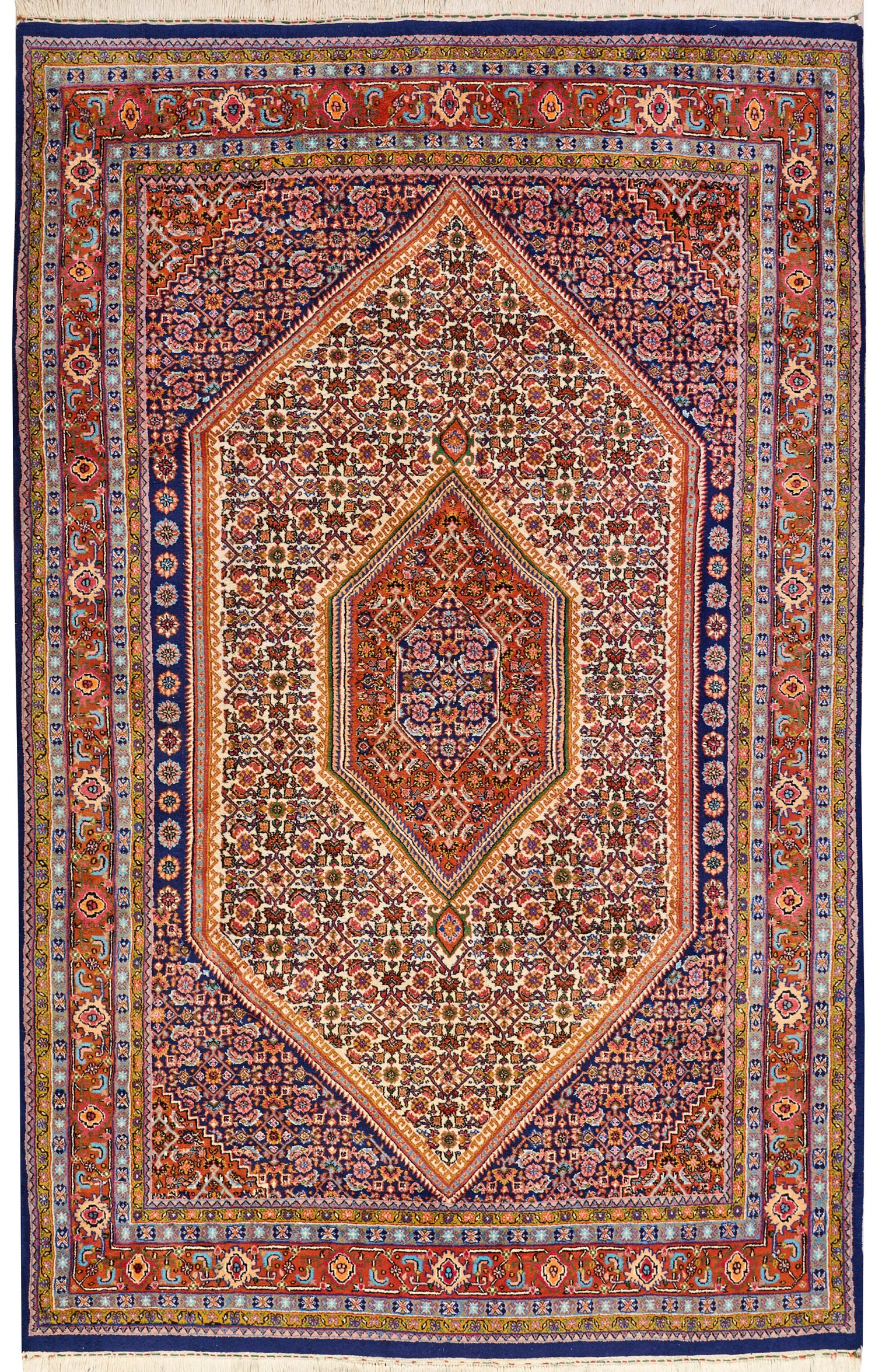 Indien. Wolle auf Baumwolle. Auf dunkelblauem Fond gestaffelt angeordnete Rautenfelder sowie flächendeckend dichte Herati-Musterung. Umlaufend breite, rotgrundige Bordüre aus Palmettenranken, flankiert von hellblauen Bändern. 194 cm x 300 cm.