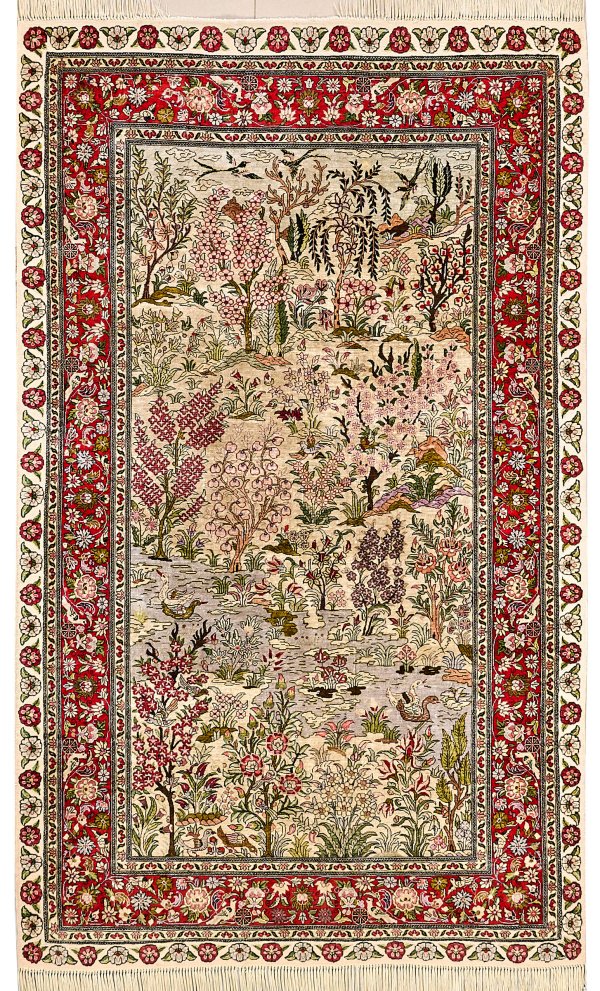 Seide auf Seide. Sehr feine Knüpfung. Im Innenfeld flächendeckende Paradiesgartenmusterung mit Flusslauf, unterschiedlichen Blütenzweigen und Vögeln. Umlaufend breite, rotgrundige Bordüre aus Blütenranken, flankiert von schmalen Bändern. 153 cm x 93 cm.