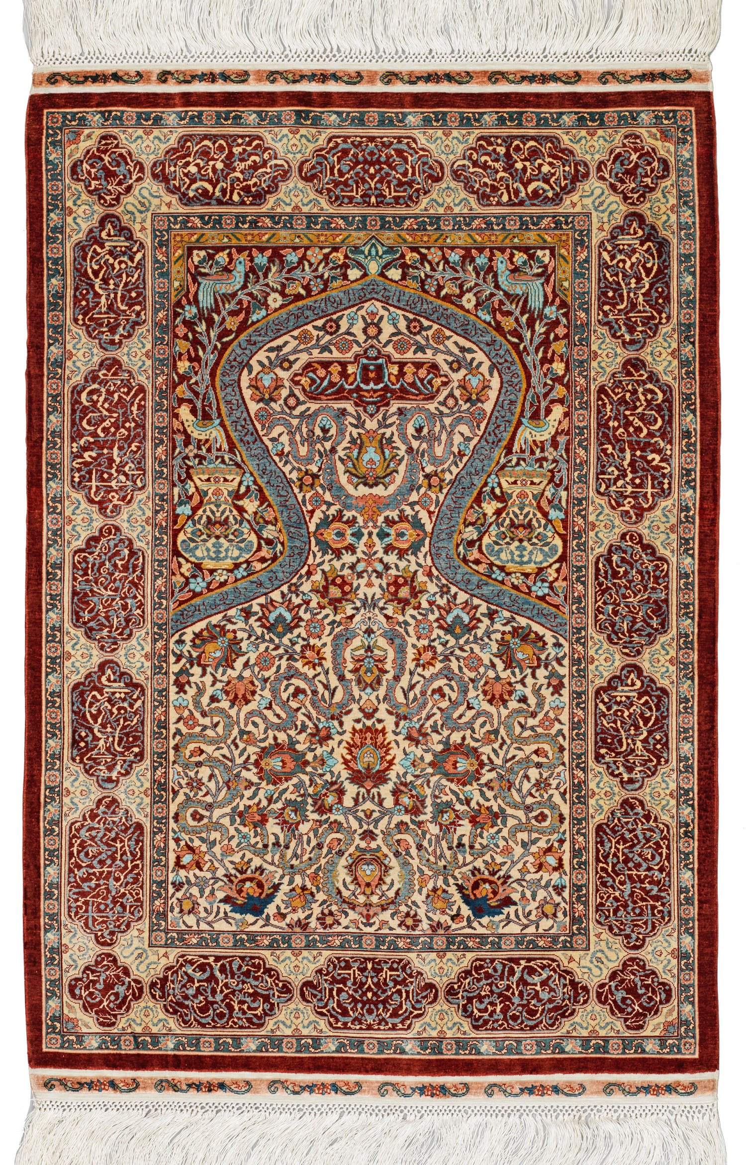 Türkei. Seide auf Seide. Selten feine Knüpfung. Ca. 3 Mio. Knoten/qm. Auf elfenbeinfarbenem Fond geschweifte, bordeauxrote Nische mit großen Vasenmotiven und Vögeln. Flächendeckend dichte Musterung aus Arabesken und üppigen Palmettenranken. Umlaufend breite Hauptbordüre mit großen arabischen und persischen Schriftkartuschen, begrenzt von schmalen Blütenbändern. 60 cm x 41 cm.
