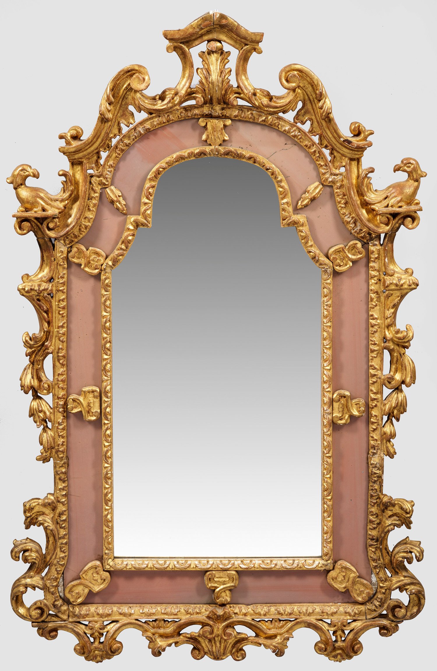 Holz, geschnitzt, gefasst und vergoldet sowie roséfarben hinterlegtes Glas. Gerade, hochrechteckige Spiegelrahmung aus schmalen, ornamentierten Streben mit hochgewölbtem oberen Abschluss. Durchbrochen gearbeitete Bekrönung aus gegeneinander gestellten Voluten, Blattwerk und reliefplastischen Vögeln. 124 cm x 80 cm.