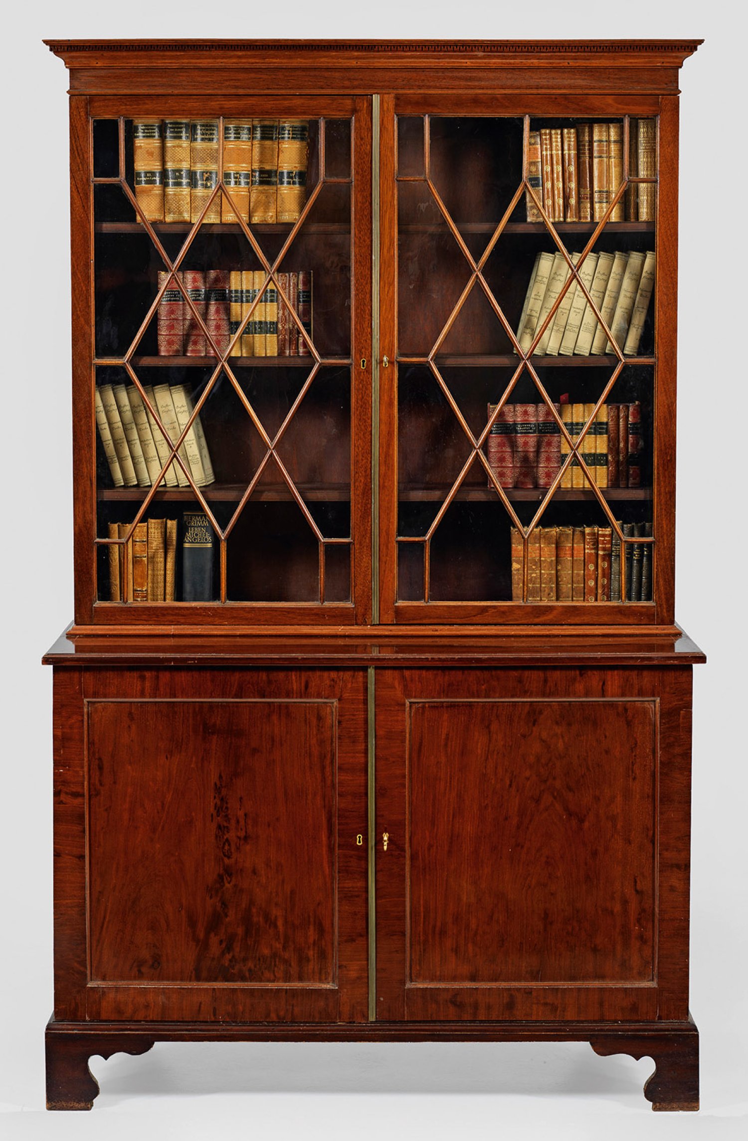 Mahagoni. Gerader, querrechteckig angelegter, zweitüriger Korpus auf schmaler Profilzarge und gesägten Füßen. Oberhalb korrespondierender, zweitürig sprossenverglaster Vitrinenaufsatz mit leicht vorkragendem Profilgesims. H. 202 cm. 126 cm x 57 cm.