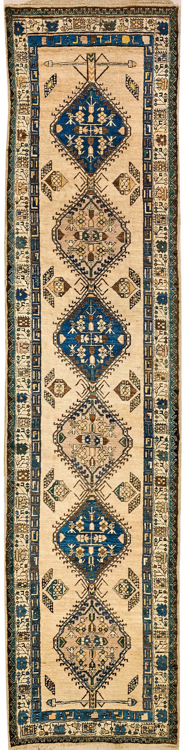 Persien. Um 1930. Wolle auf Baumwolle. Auf beigefarbenem Fond sechs große, hakenbesetzte Rauten in Blau und Beige. Umlaufend breite Bordüre von korrespondierender Farbigkeit. 400 cm x 100 cm.