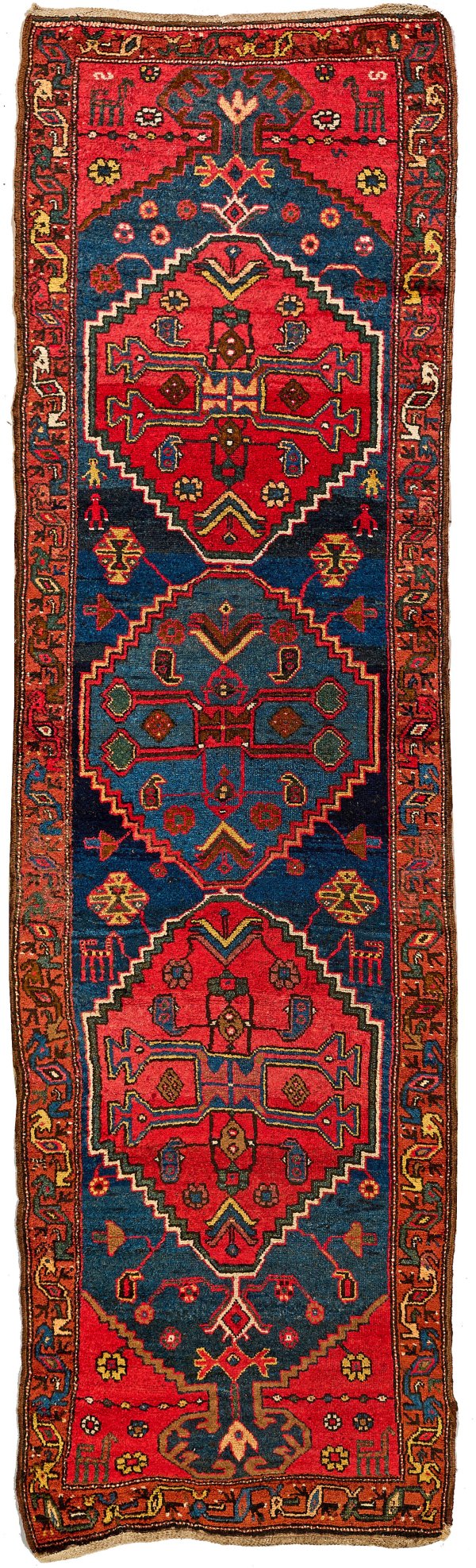 Persien. Um 1920. Wolle auf Baumwolle. Im blauen, abraschierten Innenfeld drei große Rautenmotive sowie lose gestreute Rosetten und stilisierte Figuren. Umlaufend rotgrundige Bordüre aus Arabesken. 300 cm x 85 cm.