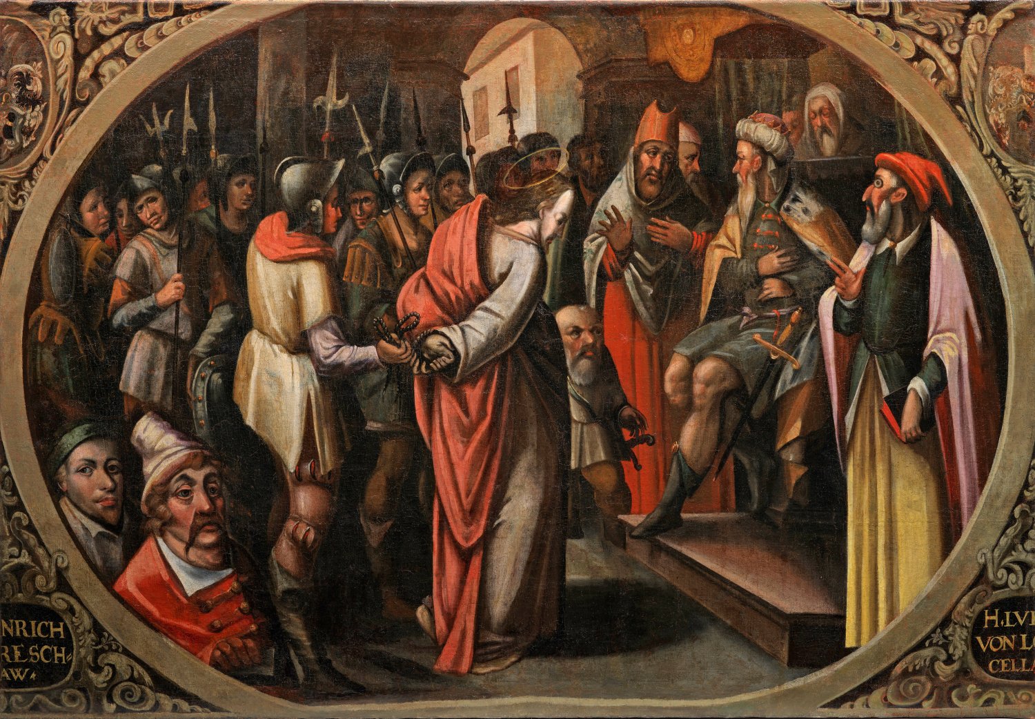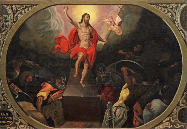 Die querovalen Kompositionen geben in vielfigurigen Szenen verschiedene Erzählungen aus der Passionsgeschichte nach den Evangelien im Neuen Testament wieder. In zwei Gemälden wird der gefangene, von Schergen umringte Jesus Christus vor Herodes bzw. im Palast des römischen Statthalters Pontius Pilatus, der seine Hände nach der Verurteilung in Unschuld wäscht (Matth. 27,24-26) gezeigt. Das dritte Gemälde schildert die Auferstehung Jesu Christi, flankiert von schlafenden sowie von Angst erfüllten, aufgeschreckten Wächtern (Matth. 28, 4). In den angeschnittenen Zwickeln befinden sich Kartuschen mit Wappen und Namen von Stiftern, umrahmt von Akanthusranken. Die manieristischen Darstellungen basieren vermutlich auf Kupferstichen von Maerten de Vos oder sind durch diese inspiriert. Der Künstler hat hierbei zur Ausdruckssteigerung in der Schilderung des Geschehens, jedoch insbesondere bei den jüdischen Figuren und den Schergen ihre Statur, Physiognomie, Gestik und Mimik grotesk gesteigert. Öl/Lwd., teilw. doubl.; 118,5 cm-120,5 cm x 174 cm-176 cm. Ein Gemälde mit Rahmen.