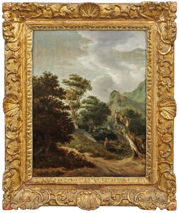 Diese stimmungsvolle Landschaftsimpression mit atmosphärisch geschildertem Wolkenspiel weist in Thematik und Konzeption deutliche Anleihen aus den Dünenlandschaften Jacob van Ruisdaels der späten 1640er auf. Auch das von Ruisdael erfundene, von seinen Nachfolgern häufig aufgegriffene Motiv des verdorrten, abgestorbenen Baums wird in dem vorliegenden Kabinettstück rezipiert. Der Einfluss van Ruisdaels ist somit absolut evident, doch die spezifische Darstellung von Laub und Erde, aber auch die kühle Farbpalette und die Staffage sehr kleiner Randfiguren im Hintergrund sind charakteristisch für das Oeuvre Roelof Jansz. van Vries', der dem unmittelbaren Umkreis Jakob van Ruisdaels zugerechnet wird. Vergleichbare Werke van Vries' sind vom RKD dokumentiert und befinden sich u. a. im Rijksmuseum in Amsterdam. Öl/Eichenholztafel. Verso zwei rote Lacksiegel. 37 cm x 30 cm. Rahmen.