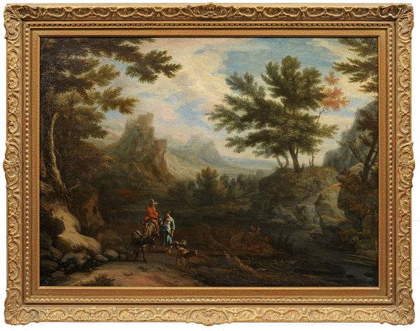 Weiter Blick auf eine bergige, baumbestandene Landschaft mit kleinem Wasserfall und Fluss; im Vordergrund ein ziehendes Paar mit Esel, Maultier, Ziege und Schaf. Berchem, der wahrscheinlich selbst Italien bereiste, zählt zu den bedeutendsten und nachhaltig prägenden Vertretern der niederländischen Landschaftsmalerei des 17. Jhs., wobei er seine Werke mit Vorliebe durch Hirtenmotive belebte. Berchems arkadische, oft italienisierende Landschaften ragen durch ihre subtile Wiedergabe des Lichts heraus. Hierbei wurde er vermutlich durch französische und italienische Barock-Maler wie Claude Lorrain, Nicolas und Gaspard Poussin beeinflusst. Als Meister der lebendigen Figuren- und Tiermalerei war er auch bei Malerkollegen wie Jacob van Ruisdael oder Meindert Hobbema gefragt, die ihn mit Personen- und Tierstaffagen in ihren Bildern beauftragten. Öl/Lwd.; 70 cm x 100 cm. Rahmen.