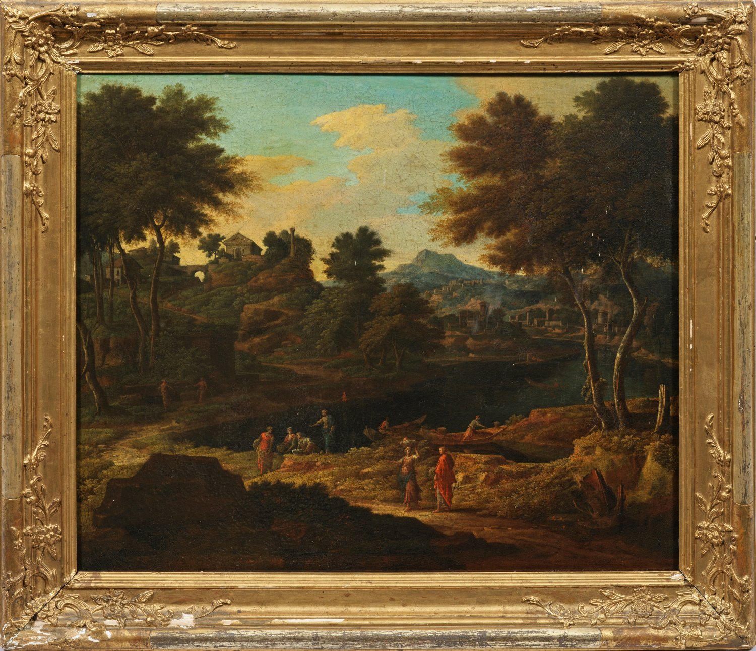 Blick auf eine bergige, baumbestandene, italienische Flusslandschaft, die im Vorder- und Mittelgrund durch unterschiedliche Figuren am Ufer belebt wird. In Motiv, Komposition und Stil überaus charakteristisches, atmosphärisch gestimmtes Werk des bedeutenden italienischen Landschaftsmalers. Er war 1631-1635 Schüler von Nicolas Poussin, der ihn nachhaltig prägte, später wurde er dessen Schwager und nahm sogar seinen Namen an. Sein ebenfalls in Rom tätiger Künstlerkollege Claude Lorrain inspirierte ihn dazu, sich auf arkadische, idealisierte Landschaften der Campagna, insbesondere der Umgebung Tivolis, zu spezialisieren. Seine Gemälde gelangten besonders in englische Sammlungen, die Royal Collection und in berühmte Museen wie die National Gallery in London und Eremitage in St. Petersburg. Öl/Lwd., doubl.; 56 cm x 68 cm. Rahmen.