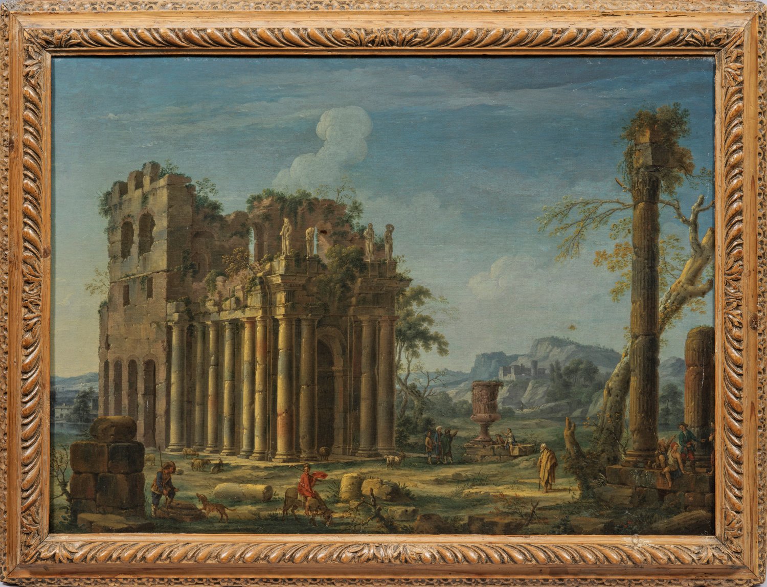 Italienische Landschaft mit Ruinen und Figuren