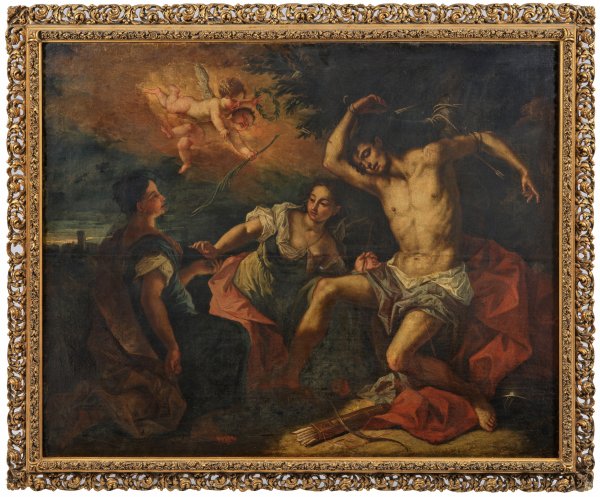 Szenische Darstellung der Heiligenlegende in abendlich gestimmter Landschaft mit dem an einen Baum gebundenen, als schöner, adonishafter Jüngling geschilderten Sebastian, dem gerade ein Pfeil aus dem Oberschenkel gezogen wird; im Himmel schwebend zwei Engel mit Märtyrerpalme und Lorbeerkranz. Wegen seines Bekenntnisses zum Christentum sollte der römische Legionär Sebastian auf Befehl des Kaisers Diokletian durch numidische Bogenschützen hingerichtet werden, überlebte jedoch zunächst durch ein Wunder. Von der frommen christlichen Witwe Irene und einer Dienerin gepflegt, kam er nämlich wieder zu Kräften. Da sich Sebastian allerdings erneut zu seinem Glauben bekannte, wurde er schließlich noch einmal hingerichtet und damit endgültig zum Märtyrer. Der Hl. Sebastian wurde zu einem der beliebtesten Themen in der europäischen Malerei der Renaissance und des Barock, insbesondere in Italien. Das vorliegende, monumental große Gemälde ist vermutlich von einem Maler in Rom geschaffen worden, beeinflusst durch Annibale Carracci und Caravaggio, wobei die Figurengestaltung des Sebastian auf ein genaues Studium der menschlichen Anatomie schließen lässt. Öl/Lwd., doubl.; 158,5 cm x 198,5 cm. Rahmen.