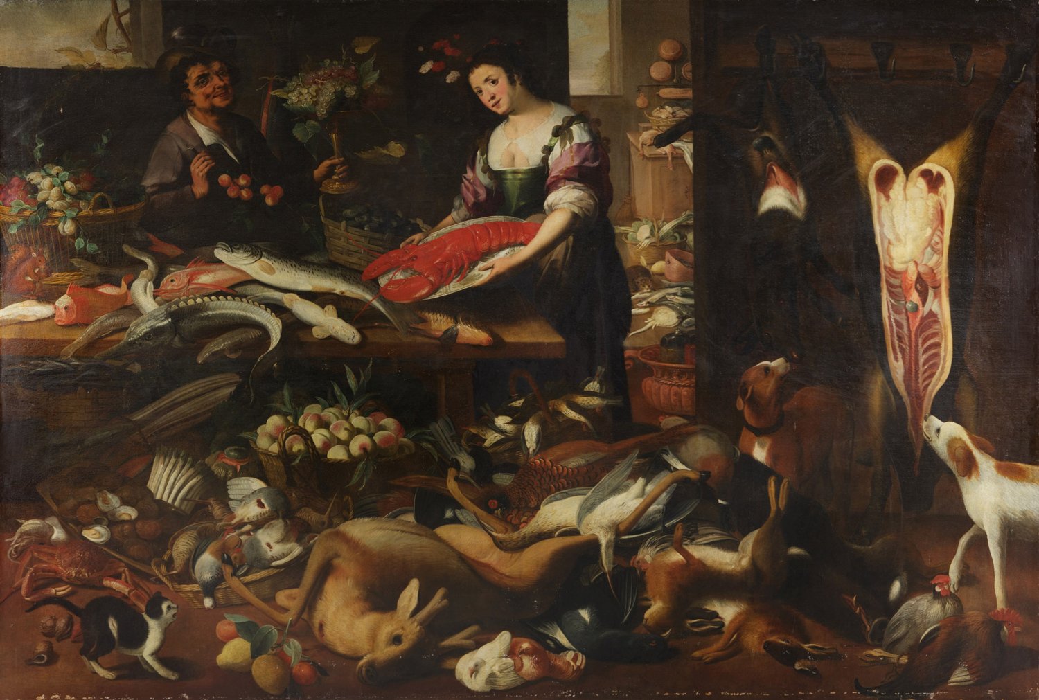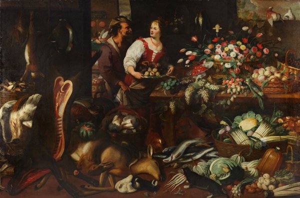 Gegenstücke. Die monumental großen Gemälde schildern in der Art eines "Wimmelbildes" opulent gefüllte Vorratskammern mit unterschiedlichsten delikaten Speisen - Früchte, Gemüse, Wild, Fische und Meeresfrüchte. Diese locken auch diverse lebendige Tiere, wie mehrere Hunde, eine Katze, einen Marder, ein Eichhörnchen, einen Papagei und ein Taubenpaar an. Hinzukommen jeweils ein Figurenpaar mit einer Küchenmagd bzw. einer jungen Dame, die auf einem der Gemälde auch die fleischlichen Gelüste eines älteren Mannes erregt. Jan van Kessel der Jüngere wurde in Antwerpen als Sohn von Jan van Kessel dem Älteren (1626 - 1679) und Maria van Apshoven geboren. Er entstammte der berühmten flämischen Malerdynastie der Familie Brueghel. Sein Vater war der Sohn von Hieronymus van Kessel dem Jüngeren und Paschasia Brueghel (der Tochter von Jan Brueghel dem Älteren ). Jan van Kessel der Jüngere war somit über seine Großmutter väterlicherseits der Urenkel von Jan Brueghel dem Älteren und Ururenkel von Pieter Brueghel dem Älteren. Er wurde wahrscheinlich von seinem Vater Jan van Kessel dem Älteren ausgebildet, statt Meister der Antwerpener Lukasgilde zu werden, ging er jedoch schon 1679 oder früher nach Madrid, wo er Hofmaler wurde und man ihn 1686 offiziell zum Maler der Königin ernannte. Öl/Lwd., doubl.; 210 cm - 214 cm x 313 cm - 318 cm.