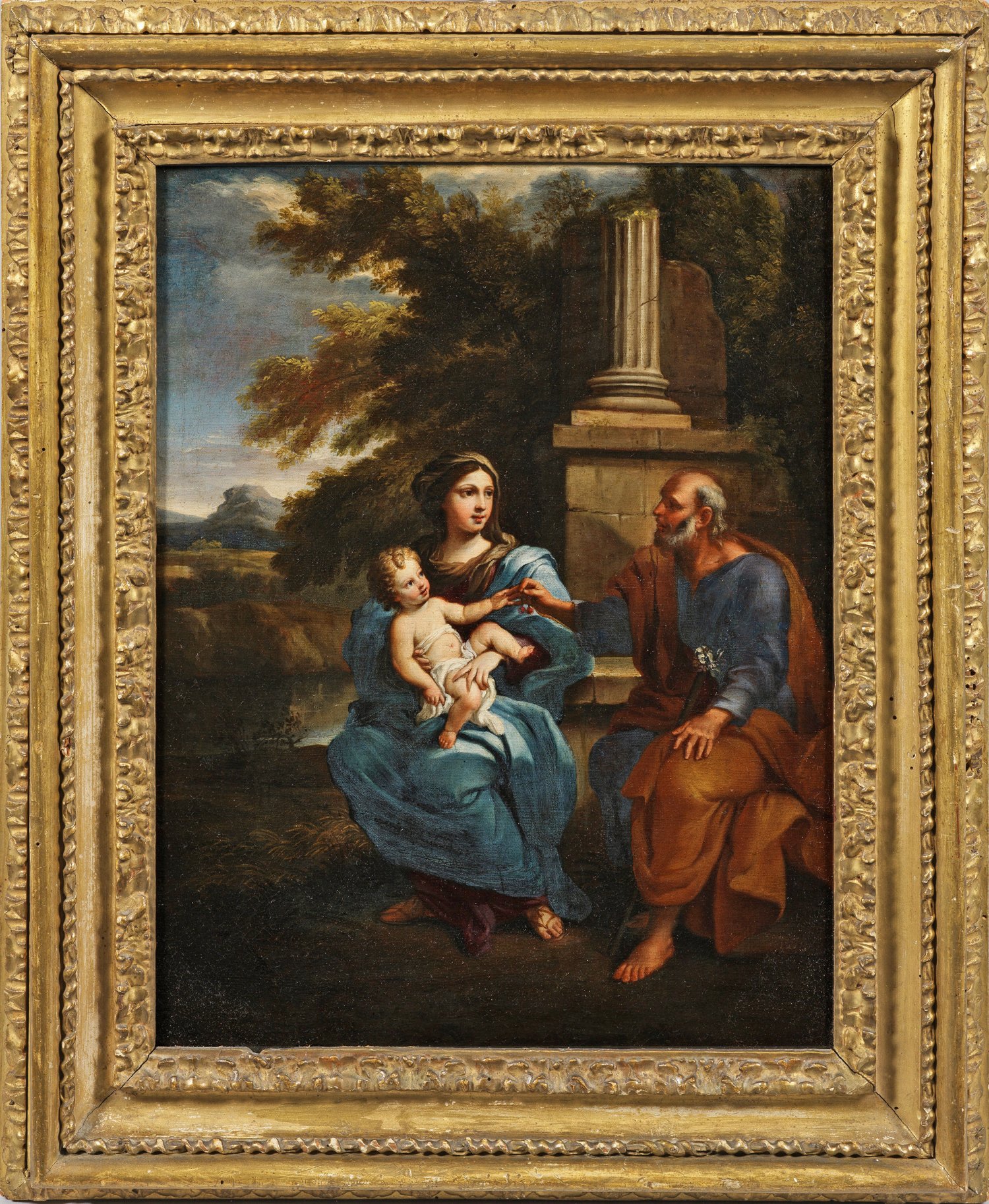 Szene in einer italienischen Landschaft vor einer antiken römischen Ruine mit Säule und einer Baumgruppe. Auf diesem Gemälde sitzt die Hl. Familie direkt unterhalb der Säule und Josef reicht dem lebhaften Kind ein reifes, rot leuchtendes Kirschenpaar. Odazzi war ein Schüler von Ciro Ferri und Cornelis Blomaert, arbeitete danach bei Giovanni Battista Gaulli (Bacciccio); schließlich ging er zu Carlo Maratta, bei dem Odazzi seine Kunst weiterentwickelte. Zu den weiteren Einflüssen auf Odazzis Stil zählt Raffael, den man im 18. Jh. für die Sanftheit seiner Figuren sehr bewunderte. 1705 wurde Odazzi Mitglied der Congregazione dei Virtuosi al Pantheon und 1706 Mitglied der Accademia di San Luca in Rom. In den Jahren danach erhielt Odazzi eine Reihe von bedeutenden Aufträgen für Gemälde und Fresken in Kirchen. Nach dem Tod Marattas (1713) übernahm Odazzi eine Führungsrolle in der römischen Schule des Spätbarock und Rokoko, gab der italienischen Kunst des 18. Jhs. wichtige Impulse. Eines der wiederkehrenden Motive in Odazzis Oeuvre war die Ruhe auf der Flucht nach Ägypten, die er in unterschiedlichsten Versionen malte. Öl/Lwd.; 48 cm x 36 cm. Rahmen.