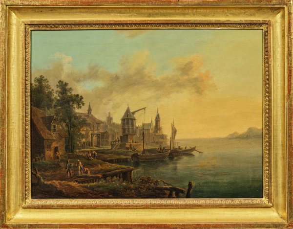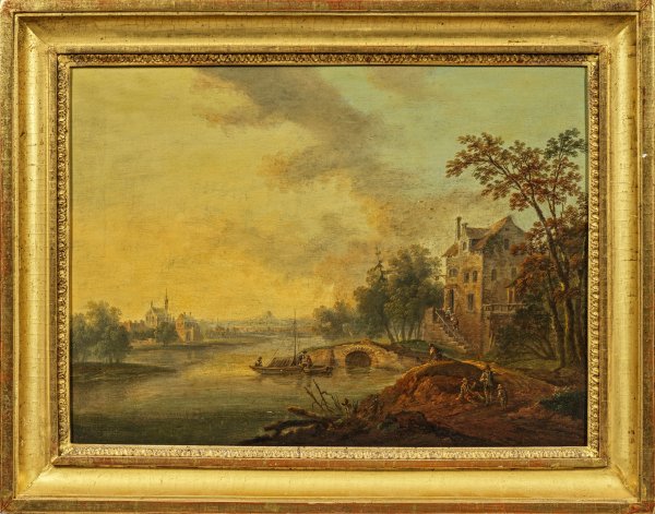 Gegenstücke. Fein gemalte, atmosphärisch gestimmte, subtil ausgeführte Ideallandschaften, die in Motiv und Stil deutliche Parallelen zu den Werken Christian Georg Schütt des Älteren aufweisen, der hauptsächlich im Mittelrheingebiet und in Frankfurt tätig war und sich auf von der niederländischen Malerei des 17. Jhs. inspirierte Flusslandschaften spezialisiert hatte. Öl/Lwd., doubliert. Je rücks. Beschriftungen (Besitzvermerk?) mit der Jahreszahl 1840. 39,5 cm x 53,5 cm. Rahmen.