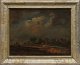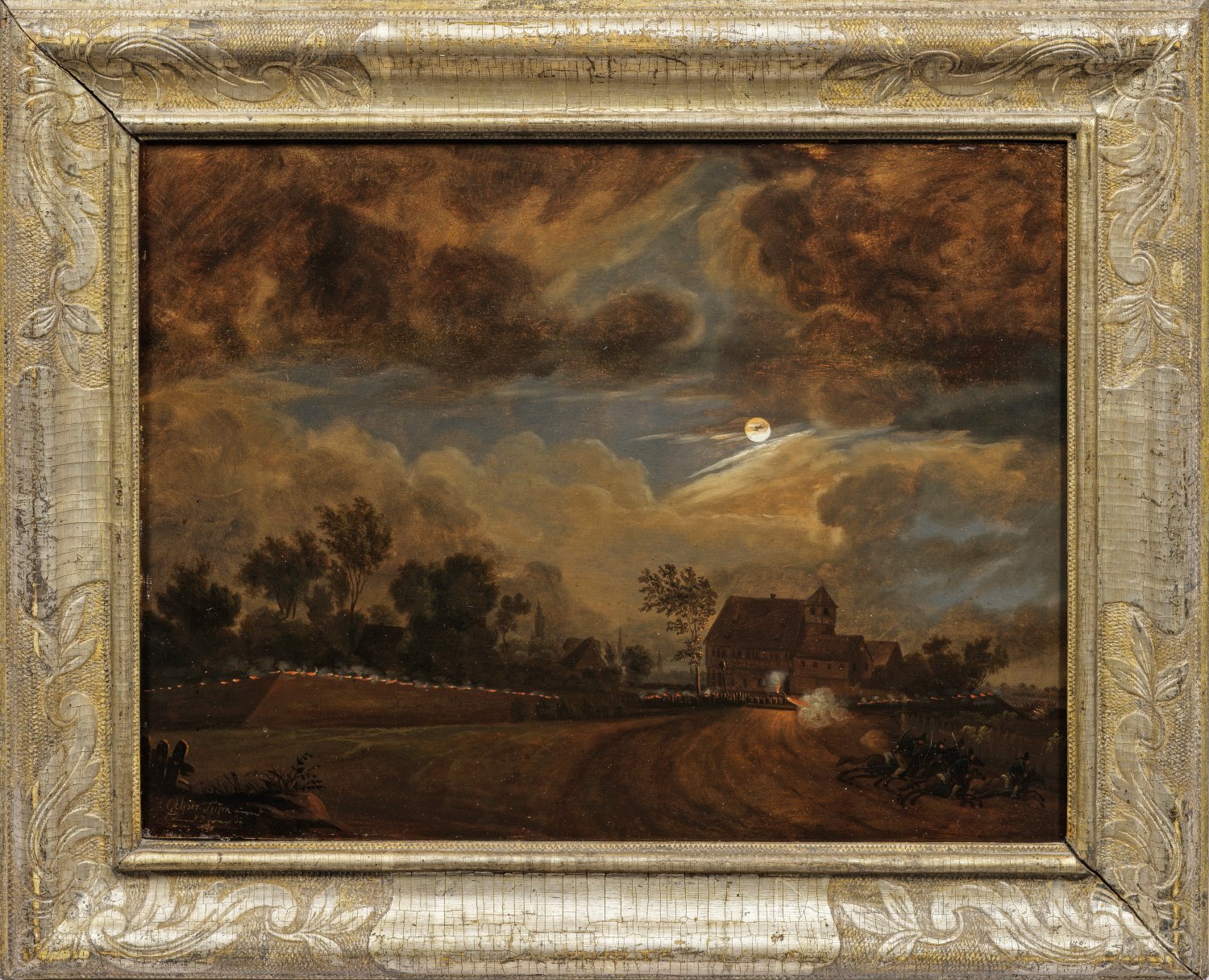 Gegenstücke. Fein lasierend gemalte, historisch bedeutende, teilw. minutiöse, szenische Darstellungen des nächtlichen, tobenden Gefechts mit topographisch erkennbaren Landschaften, eine vor dem Ölper Turm im Mondlicht. Öl/Eichenholztafel. Verso bzw. auf dem Rahmen alte montierte Klebezettel mit Bez. u. Betitelung "aus der Erbschaft der Fürstin Auguste v. Waldeck (/) die action bei Oelpe den 13. auf 14. October 1761" sowie "Oelper Thurm & Landstraße 1761 (...)", außerdem jeweils Inventaretikett "Herrschaft Carlsruhe O/S" mit Nr. 236 bzw. 237 sowie Stempel "Schlossverwaltung Lindach". 31,5 cm x 41 cm. Rahmen.