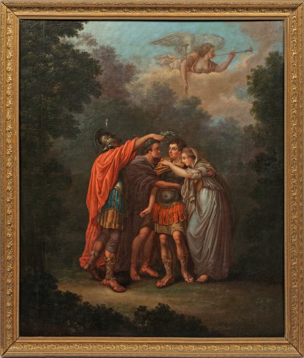 Szene aus Goethes klassizistischem Drama "Iphgienie auf Tauris", bei der Orest mit Lorbeer bekränzt wird, im Himmel ein Posaune blasender Engel, komponiert in eine arkadische Parklandschaft. Deutlich erkennbar ist vor allem der junge Johann Wolfgang von Goethe, den Krauss in fast gleicher Pose in seinem bekannten Gemälde von 1779 zusammen mit Corona Schröter in der "Iphighenie"-Eröffnungsszene darstellte (Goethe-Nationalmuseum, Weimar). Auch das vorliegende Gemälde dürfte 1779 oder kurz danach entstanden sein. Die Uraufführung der "Iphigenie auf Tauris" fand am 6. April 1779 in Weimar statt, der Dichter selbst spielt den Orest, Corona Schröter (1751 - 1802) die Iphigenie, Goethes "Urfreund" Karl Ludwig von Knebel (1744 - 1834) den Thoas und der jüngere Bruder des Herzogs Prinz Constantin von Sachsen-Weimar-Eisenach (1758 - 1793) den Pylades. Krauss, ein Schüler Johann Heinrich Tischbeins d. Ä. war seit 1775 in Weimar ansässig und befreundet mit Goethe. Bereits 1775/76 entstand das berühmte Porträt Goethes mit Silhouettenbild (im Goethe-Nationalmuseum), 1776 wurde Krauss erster Direktor der neu gegründeten Zeichenschule in Weimar. Öl/Lwd.; 92 cm x 108 cm. Rahmen.