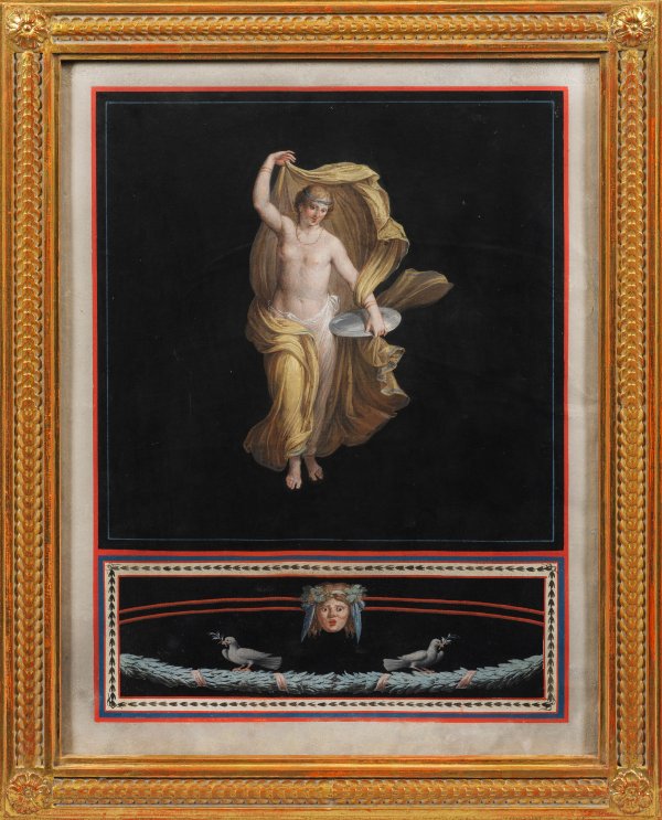 Vor schwarzem Grund schwebende Tänzerin als Halbakt, eine Silberplatte in der Hand haltend und ihr goldgelbes, wehendes Gewand emporhaltend; in der Sockelpartie der Kopf einer Bacchantin und ein Taubenpaar auf einem Lorbeerfeston. Motiv und Stil des klassizistischen Blattes lassen es Maestri zuschreiben, der durch die antiken Fresken in Pompeji und Herculaneum sowie Raffael und Romano inspiriert wurde. Viele Gouachen Maestris erwarben Adelige während ihrer Grand Tour. Das vorliegende Blatt entstand in Anlehnung an Radierungen Tommaso Pirolis aus der 1757-1792 in Neapel und später in Rom erschienenen, mehrbändigen Publikation "Le pitture antiche d'Ercolano", welche auch die Vorlage für eine um 1790 entstandene Wandmalerei in der Villa Hamilton in den Wörlitzer Parkanlagen war. Dasselbe Motiv der Tänzerin zeigt auch ein Maestri zugeschriebenes Blatt in der Sammlung des Belvedere in Wien (Inv.-Nr. SLM 401). Gouache (über Umrissradierung?)/Papier. 46 cm x 36 cm. Rahmen.