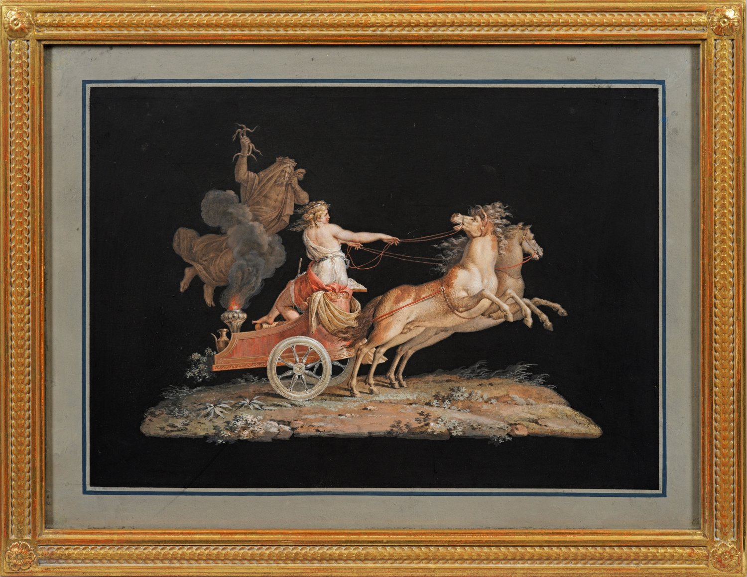 Darstellung vor schwarzem Grund mit Medea in einem von zwei Pferden gezogenem Streitwagen, hinter ihr ein Gefäß mit brennendem Feuer und einer Rauchwolke sowie die schwebende Figur des Göttervaters Zeus mit Schlangen in der erhobenen rechten Hand. Motiv und Stil des klassizistischen Blattes lassen es Maestri zuschreiben, der durch die antiken Fresken in Pompeji und Herculaneum sowie Raffael und Romano inspiriert wurde. Viele Gouachen Maestris erwarben wohlhabende Reisende und Adelige während ihrer Grand Tour. Das vorliegende Blatt entstand in enger Anlehnung an ein um 1520 geschaffenes Fresko von Giulio Romano das sich einst in der Villa Lante in Rom befand. Im Unterschied hierzu erhielt die weibliche Figur jedoch ein Gewand und wurde durch Hinzufügung des Zeus mit den Schlangen in eine Medea verwandelt. Gouache (über Umrissradierung?)/Papier. Ca. 45 cm x 60,5 cm. Rahmen.