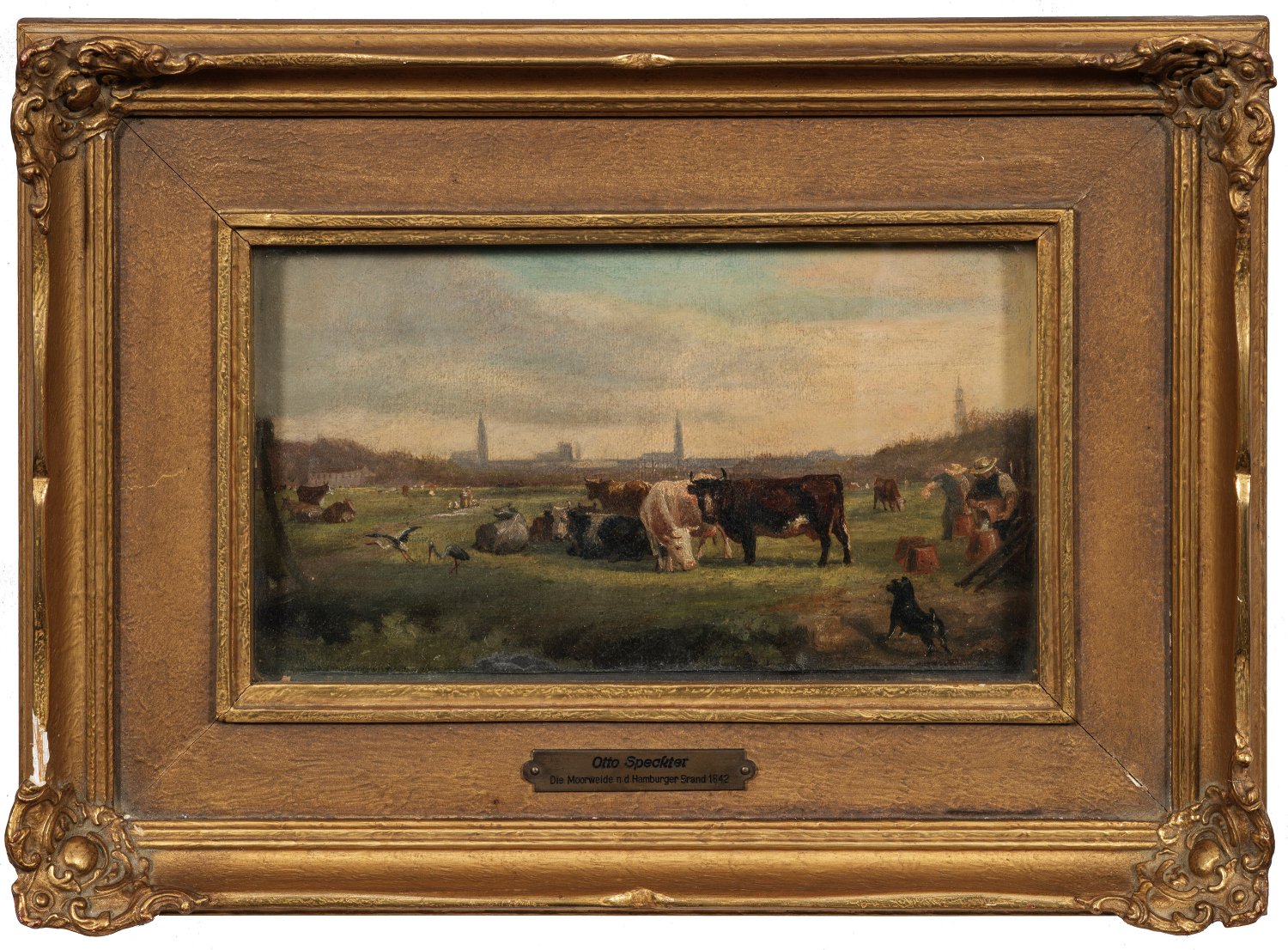 Auf einer großen Weide eine Ansammlung von Mensch und Tier, darunter Rinder, Störche und Hunde, während die Helfer Eimer mit Wasser befüllen. Im Hintergrund die Stadtsilhouette Hamburgs unter dem mit Rauchschwaden verhangenen Himmel. In lockerem Duktus und toniger Palette gemalte, historisch bedeutende Impression Speckters, der Gründungsmitglied des Hamburger Künstlervereins von 1832 war. Öl/Papier, kaschiert auf Karton. Verso mit div. Papieretiketten (Fragmente) sowie bez. "Otto Speckter (/) Studie zu einem großen Bild (/) Hamburg, die Moorweide nach (/) dessen Brand 1842" und "Angekauft 1941 (/) stammt aus der Sammlung (/) Hans Dunker.". 16,3 cm x 28,1 cm. Karton 17,3 cm x 28,9 cm. Rahmen.