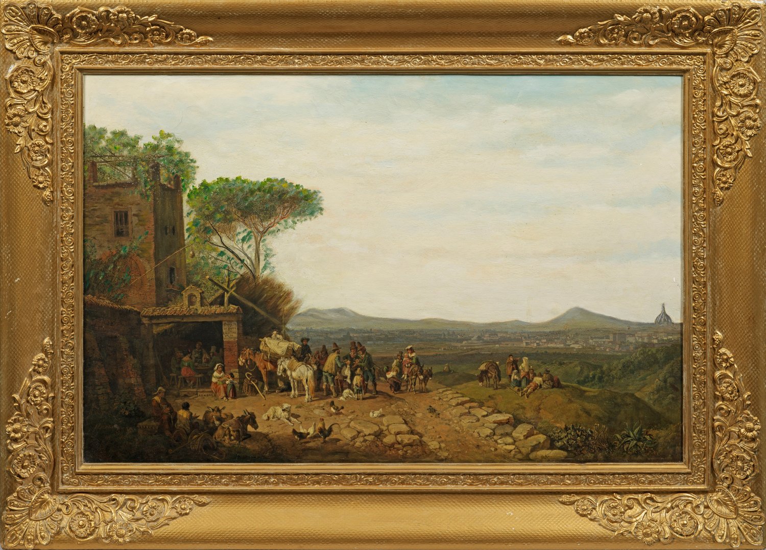 Gezeigt wird eine einfache Osteria vor der Kulisse der unterhalb liegenden ewigen Stadt, Bürkel selbst bezeichnete diese Darstellung als "das große Rom". Im Vordergrund und Mittelpunkt der erzählerischen Schilderung steht das lebhafte, pittoreske Treiben vor bzw. an der Osteria. Diese preist sich selbst auf einem Schild mit dem hintersinnigen, humorvollen italienischen Sprichwort an: "Oggi si paga/Domani si fa credenza". Ganz vorne rasten zwei Hirten (oder Bauern) mit ihren Maultieren; während auf den Stufen zur spärlich überdachten Osteria eine Mutter in Albaner Tracht sitzt und sich um ihr Kleinkind und junge Tochter kümmert, bedient der Wirt dahinter eine kleine, etwas vornehmere Gruppe von drei Gästen. Neben der Osteria, vor der ruhig zwei Last- und Reitpferde stehen, entspinnt sich gerade ein reges, beredtes Feilschen um Lämmer. Auf der Landstraße zieht eine ländliche Familie vorüber, zugleich rasten auf der daneben liegenden Wiese weitere Landleute in Tracht und unterhalten sich mit einem Mönch. Mit großer Liebe und Sorgfalt zum Detail und den lebendig wiedergegebenen Tieren sowie feinsinniger Beobachtungsgabe schildert Bürkel hier das römische Volksleben, nicht frei von einer gewissen Ironie und Humor. Insgesamt vier Mal besuchte er Italien (1827, 1830, 1838 und 1853). Dort interessierte er sich außer für das eigentliche Studium der Landschaft allerdings auch für das Alltagsleben, insbesondere Schilderungen des ländlichen Lebens. Schon 1834 zeigte Bürkel eine "Osteria bei Rom" auf der Berliner-Akademie-Ausstellung (Boetticher Nr. 15). 1846 entstand eine wohl erste Version des vorliegenden Gemäldes (Bühler/Krückl Nr. 530). Bis 1860 entstanden in München in dichter zeitlicher Folge noch eine Reihe weiterer Fassungen mit diesem Motiv - Bürkel führte in der eigenen Zusammenstellung seiner Werke insgesamt sieben Varianten auf. Obwohl das vorliegende, wohl in den 1850er Jahren entstandene Gemälde seinem Spätwerk zuzuordnen ist, hat es nichts von seinem Fantasiereichtum in der liebevollen Wiedergabe des italienischen Landlebens verloren. Öl/Lwd., auf Hartfaser doubliert. L. u. sign. "HBürkel" ("H" und "B" ligiert). Rest.; 61,5 cm x 94,5 cm. Rahmen.