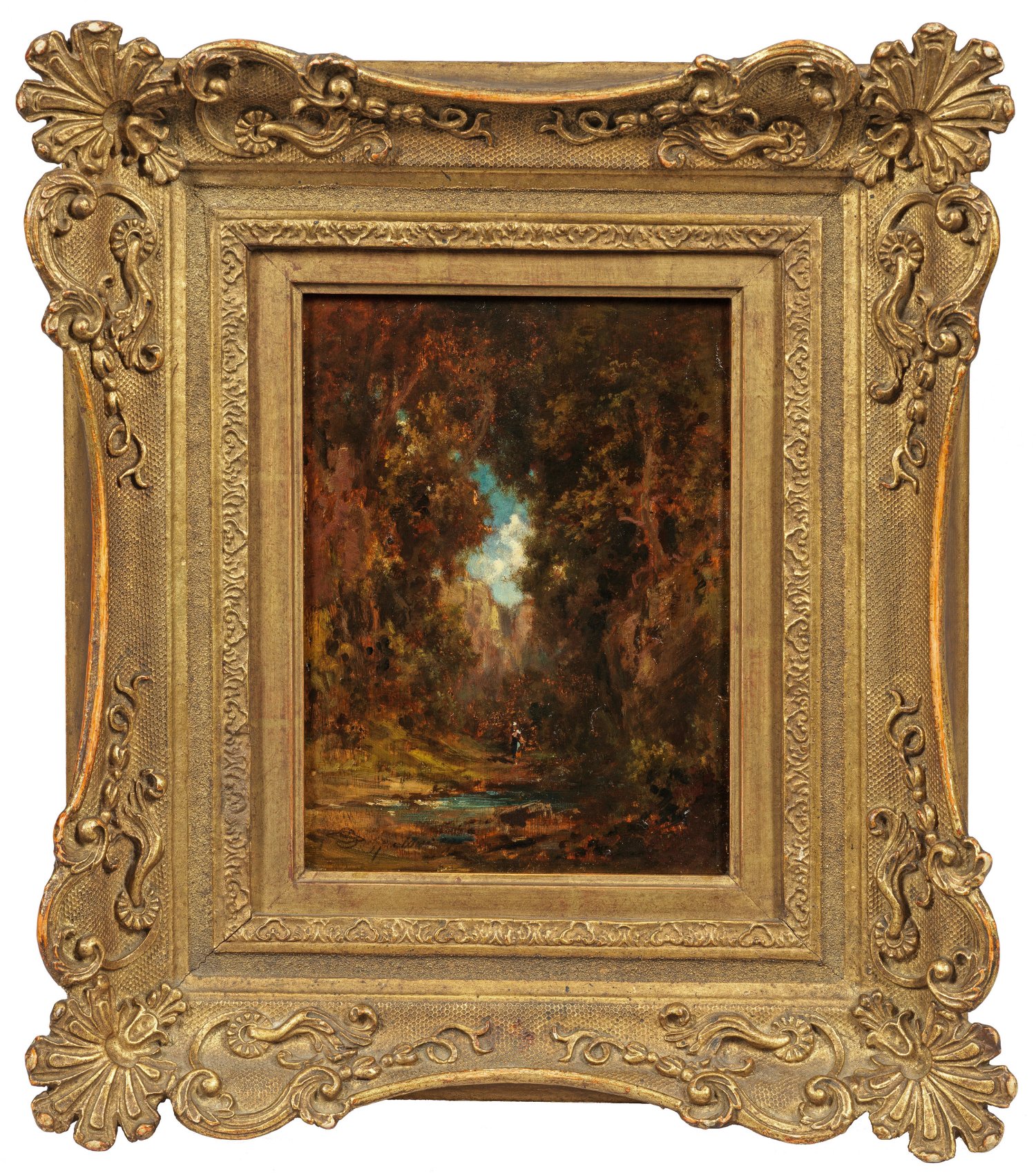 Spitzweg schildert in kleinem Hochformat eine Waldschlucht mit teilw. baumbestandenen Felswänden, mittig im Vordergrund eine kleine Wasserlache (oder Tümpel) und eine von hinten hierauf zuschreitende Sennerin. Das Gemälde gehört zu einer größeren Werkreihe von Wald- und Gebirgslandschaften Spitzwegs. Es ist exemplarisch für seine Meisterschaft, dem Betrachter einen authentischen, ersten poetischen Eindruck von der einsamen, rauen Natur wiederzugeben. In seinen Landschaften wurde Spitzweg durch den eng befreundeten Freilichtmaler Eduard Schleich d. Ä. beeinflusst. Mit ihm reiste er u. a. nach Paris, wo die Schule von Barbizon einen großen, nachhaltig prägenden Eindruck auf beide hatte. Auch in diesem Gemälde Spitzwegs ist der Barbizon-Einfluss in einer freieren, flächigeren, summarischen Malweise evident. Es ging Spitzweg um die Gesamtstimmung, die hier durch Licht, Verschattungen und Farbakzente gesteigert wird. Spitzwegs Malerei wurde im Laufe der Zeit immer offener und lichtdurchfluteter, er fand zu eigenen, fortschrittlichen, dem Impressionismus den Weg ebnenden Tendenzen. Öl/Zigarrenkistenholz. L. u. Nachlass-Stempel; Verso nochmals der zweifache Nachlass-Stempel (auf dem Holz) sowie Etikett mit Nachlass-Stempel u. Echtheitsbestätigung von Carl Spitzwegs Neffen Otto Spitzweg (1843 - 1921): "Bezeuge hiemit, daß das Bild Mädchen im Walde auf Holz (Cigarren) 14 1/2 x 19 1/2 von unserem Onkel Kunstmaler Carl Spitzweg gemalt und 1886 in meinen Besitz übergegangen ist. München, den 26 October 1902 Otto Spitzweg"; zwei Etiketten mit Nr. 254 bzw. 386(?). 19,5 x 14,5 cm. Rahmen.