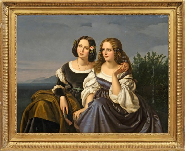 Doppelbildnis eines dunkelhaarigen und eines blonden Mädchens, innig vertraut nebeneinander vor einer italienischen Küstenlandschaft sitzend, inspiriert durch die literarische Vorlage der beiden "Leonoren" (Leonore von Este und Leonore Sanvitale) aus Goethes Schauspiel "Torquato Tasso". Fein lasierend gemalte Darstellung nach dem bekannten Gemälde Sohns, das er 1842 in der Ausstellung der Berliner Akademie zeigte und welches kurz nach seiner Entstehung auch in einer Lithographie von C. Wildt populär wurde. Bereits 1834-1836 hatte Sohn das thematisch und motivisch vergleichbare Schwesternbildnis "Die beiden Leonoren" mit ähnlichem Landschaftshintergrund gemalt. Der seit 1867 in Düsseldorf ansässige Maler lehrte ab 1832 an der Akademie und wurde 1838 dort zum Professor ernannt; zugleich nahm ihn 1833 die Berliner Akademie als Mitglied auf. Öl/Metalltafel. 67,5 cm x 87 cm. Rahmen.
