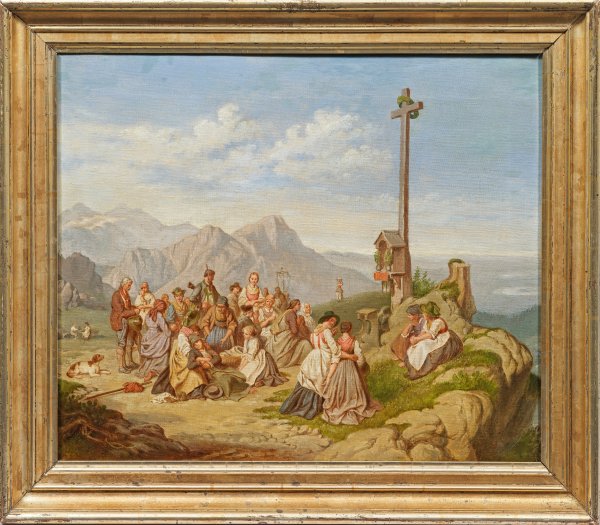 An einem Marterl auf einem begrünten Felsplateau, unter duftig bewölktem Himmel eine rastende Pilgergruppe. Während im Vordergrund eine erschöpfte Pilgerin umsorgt wird, knien andere Wallfahrtsteilnehmer nieder und beten, einige halten ein Schwätzchen oder haben sich im Gras niedergelassen, um sich auszuruhen. Feinmalerisch, in warmem Kolorit gemaltes Motiv, das Foltz in einem seiner großformatigen Hauptwerke, das sich heute in der Bayerischen Staatsgemäldesammlung in München (Inv.-Nr. 7706) befindet, aufgriff, wobei er die alpenländische Topografie und die Figurenkomposition leicht variierte. Zunächst Schüler bei seinem Vater, dem Kunstmaler und Zeichenlehrer Ludwig Foltz (1778 - 1848), wurde Foltz 1825 Schüler von Peter von Cornelius in München. 1835-1838 hielt er sich in Rom auf, wo er August Riedel (1799 - 1883) kennenlernte. Ab 1851 hatte er eine Professur an der Münchener Akademie inne, 1852 erhielt er von Maximilian II. den Auftrag für zwei Gemälde für das Maximilianeum und war 1865-1875 Direktor der Pinakotheken. Sein Oeuvre umfasst religiöse und historische Themen, aber auch alpenländische Genredarstellungen aus dem Volksleben. Öl/Lwd.; 46 cm x 58 cm. Rahmen.
