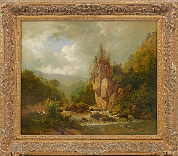 Blick auf einen von großen, baumbestandenen Felsen flankierten Fluss. Eindrucksvolle, fein gemalte, romantische Landschaft aus dem reifen Werk Koekkoeks mit akzentuierter Lichtführung und atmosphärischer Himmelsschilderung. Der Maler lernte zunächst bei seinem Vater Johannes Hermanus Koekkoek, später studierte er an der Akademie in Amsterdam. Der seit 1829 vielfach ausgezeichnete Künstler gilt als einer der bedeutendsten niederländischen Landschaftsmaler des 19. Jhs.; Studienreisen führten Koekkoek u.a. in den Harz, nach Luxemburg und Italien. 1834 wurde er in Kleve am Niederrhein ansässig, wo er 1841 eine eigene Akademie für Landschaftsmalerei gründete. Öl/Lwd., doubl.; L. u. sign. u. dat. 1856. Verso am Keilrahmen altes Lacksiegel mit Monogr.; 38 cm x 46 cm. Rahmen.
