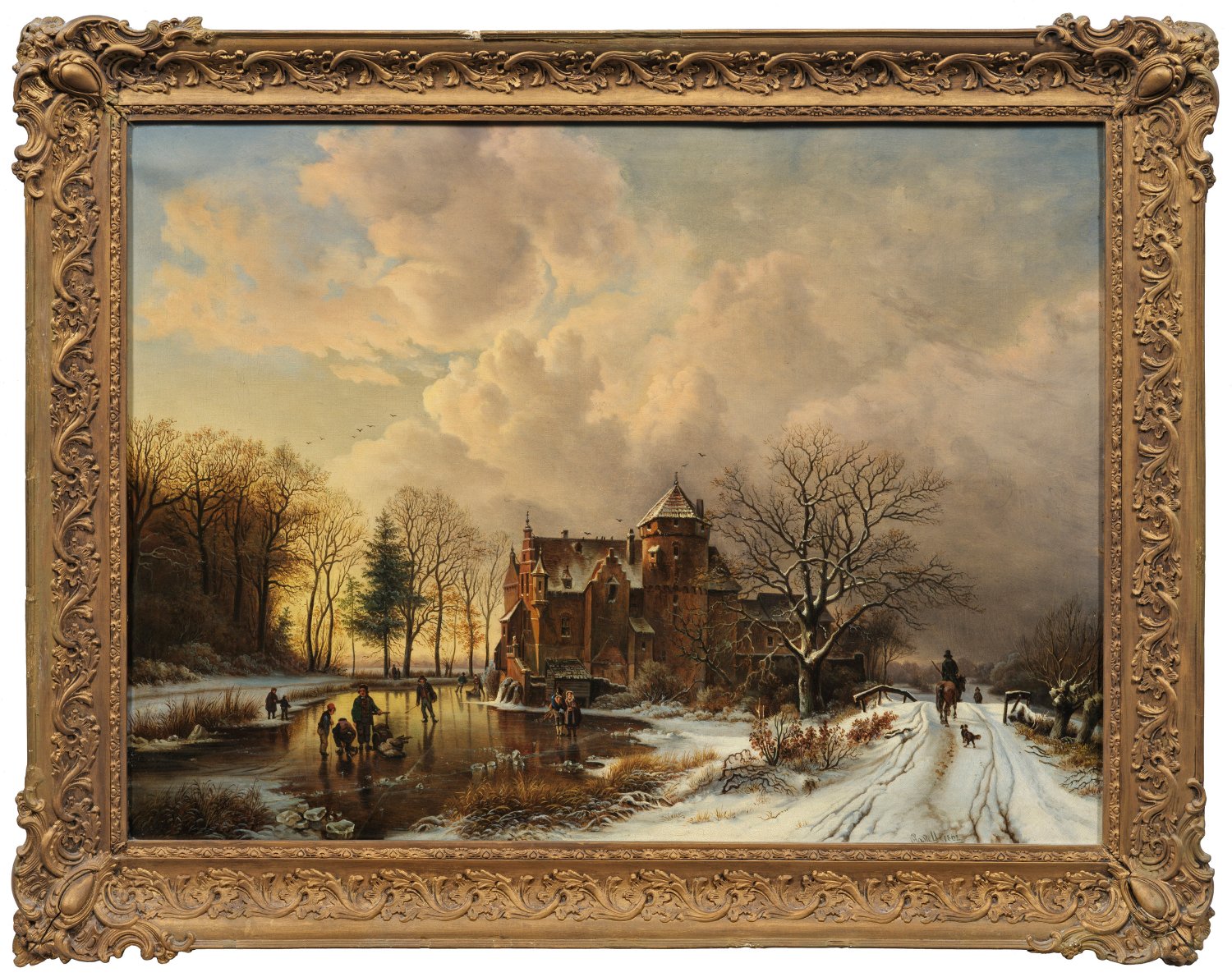 Durch Eisvergnügen und einen Reiter belebte, atmosphärisch gestimmte, spätromantische Landschaft. Castell studierte 1827/1828 an der Dresdener Akademie, danach bei J. C. Clausen Dahl, und machte sich einen Namen als angesehener Landschafts- und Vedutenmaler. Später begab er sich auf Studienreisen nach Böhmen, Wien und Tirol. Neben sächsischen Landschaften und Dresden-Ansichten bilden Italien-Motive ein Schwerpunkt seines Oeuvres. Öl/Lwd.; R. u. sign. u. dat. 1862. 68 cm x 90 cm. Rahmen.