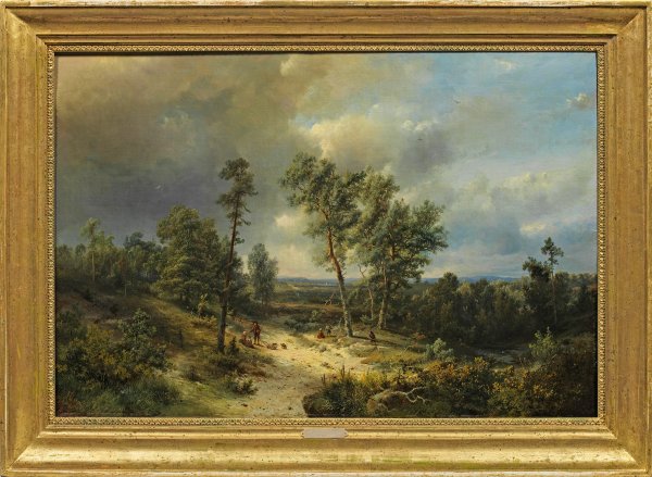 Stimmungsvolles, in Motiv, Komposition und Stil charakteristisches Werk des romantischen Malers, der sich in seinem Oeuvre bevorzugt panoramaartigen Sommer- und Winterlandschaften aus der Umgebung von Amersfoort, Arnheim, Amsterdam und Den Haag widmete. Malerisch knüpfte er an die niederländische Landschaftsmalerei des 17. Jhs. an und erzielte durch gekonnte Farbperspektive und Lichtführung einen tiefenräumlichen Eindruck und große atmosphärische Stimmung. 1838-1886 beschickte Kluyver regelmäßig die alljährlichen Ausstellungen in Amsterdam und Den Haag mit seinen künstlerisch herausragenden Landschaften, welche Vergleiche mit Werken seines Zeitgenossen Barend Cornelis Koekkoek nicht zu scheuen brauchten. Öl/Lwd., doubl.; L. u. sign.; 56 cm x 84 cm. Rahmen.