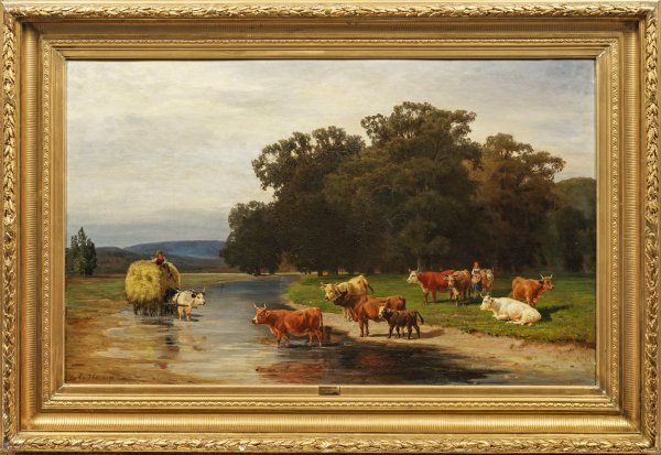 Baumbestandene Flusslandschaft mit Kühen, Heuwagen und Hirtin