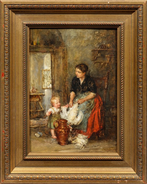 In bäuerlicher Stube eine junge Frau mit Kleinkind beim Rupfen der Hühner. Feinfühlig wiedergegebene Genreszene Gaissers, die ihren besonderen Reiz durch die effektvolle Lichtführung und die kontrastreiche Farbpalette erhält. Ausgebildet an der Münchener Akademie, spezialisierte sich der Künstler auf subtil inszenierte Genremalerei, für die er seine Inspiration auf ausgedehnten Studienreisen nach Frankreich, Italien, Holland und Belgien erhielt. Öl/Holztafel. R. u. sign.; 36 cm x 25,5 cm. Rahmen.