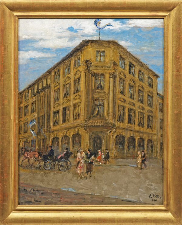 Von Passanten und Pferdekutschen belebte Straßenansicht mit dem Eckgebäude der Bayerischen Handelsbank. Impressionistisches, durch seine Lichtstimmungen und subtilen Farbakzente ansprechendes Werk Vetters, der 1881 zum Akademiestudium nach München zog und früh der neu gegründeten dortigen Sezession beitrat. Sein Oeuvre wird von künstlerisch anspruchsvollen Bildern dominiert, in denen er seine Eindrücke der Münchner Plätze, Straßen, Brunnen und Residenzräume und deren Stimmungsreize zu verschiedensten Tages- und Jahreszeiten sowie Wetterverhältnissen schildert. Öl/Lwd.; R. u. sign. und dat. 1936. Verso Inventaretiketten der Bayerischen Handelsbank (BHB). 75 cm x 59,5 cm. Rahmen.