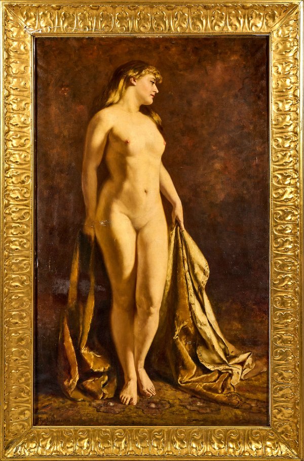 Lebensgroßer, seltener weiblicher Akt des vielseitigen Malers, inspiriert durch Oscar Wildes "Salome", ausgestellt 1906 in Berlin. Rudolf von Voigtländer studiere an den Akademien in Dresden und Antwerpen sowie bei Karl Gussow an der Karlsruher Kunstschule und Berliner Akademie; 1882-1891 war er in Brüssel tätig, seitdem in Berlin. Öl/Lwd.; L. u. sign. u. dat. (19)06. Verso Etikett der Grossen Berliner Kunstausstellung 1906 sowie Künstler-Bez.; 181 cm x 109,5 cm. Rahmen.
