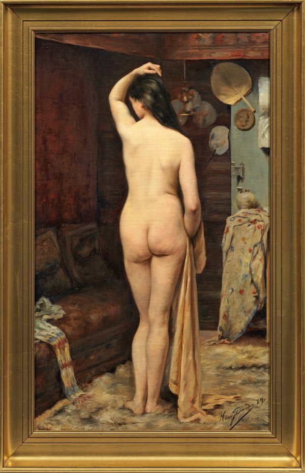 In einem Interieur mit Kanapee stehende junge Frau mit dunklem, langem Haar, den linken Arm zum Scheitel erhebend und den Kopf ganz leicht ins Profil wendend. Der auch unter Henry Daudin und Henri-Charles Daudin bekannte Künstler studierte an der École des Beaux-Arts de Paris bei Alexandre Cabanel (1823-1889) und Fernand Cormon (1845-1924). Er stellte seit 1888 vielfach im Salon des artistes français aus, wurde 1890 auch Mitglied der Société, gewann 1889 und 1907 Medaillen. Vornehmlich malte Henry-Daudin Porträts, Genreszenen, ideale Kostümszenen und nicht zuletzt Akte (noch 1909 stellte er im Salon den Akt "Diane" aus). Öl/Lwd.; R. u. sign. u. dat. (18)89. Verso Malwarenstempel von Hardy-Alan, Paris. 92 cm x 57 cm. Rahmen.