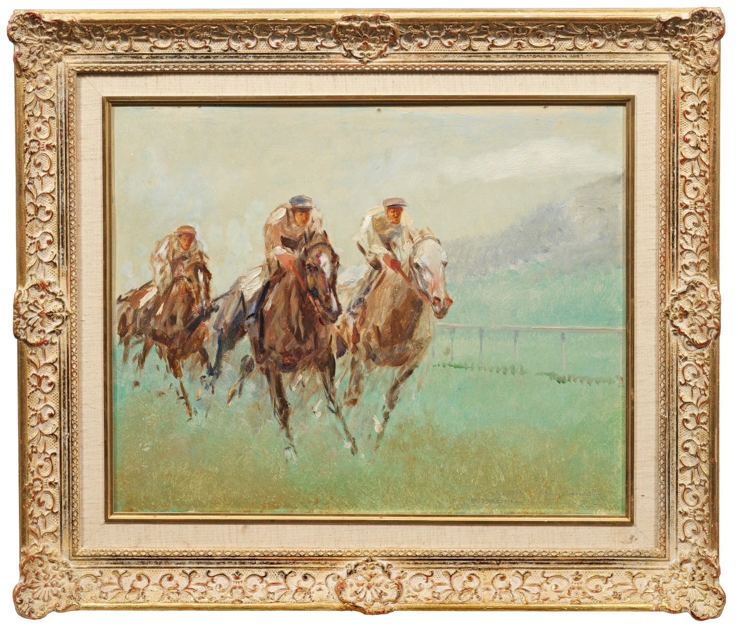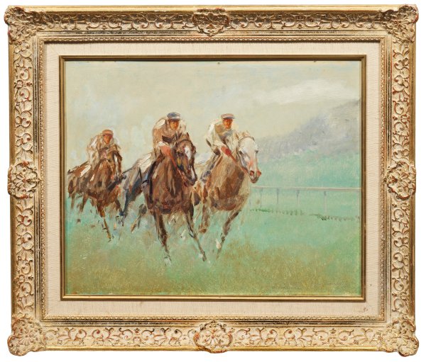 Mit schnellen, flüchtigen Pinselstrichen fängt Osswald trefflich die kraftvolle Dynamik der sprintenden Pferde ein, die sich kontrastreich vom hellen, weichmalerisch umgesetzten Hintergrund abheben. Charakteristische Szene des bekannten Tiermalers, der an der Münchner Akademie bei Angelo Jank und Heinrich von Zügel studierte und anschließend für einige Monate nach Paris ging. Öl/Karton. R. u. dat. 25.8.1925 und sign. mit Ortsangabe B(aden). Baden. Verso bez. mit Nr. 45. 40 cm x 50,3 cm. Rahmen.