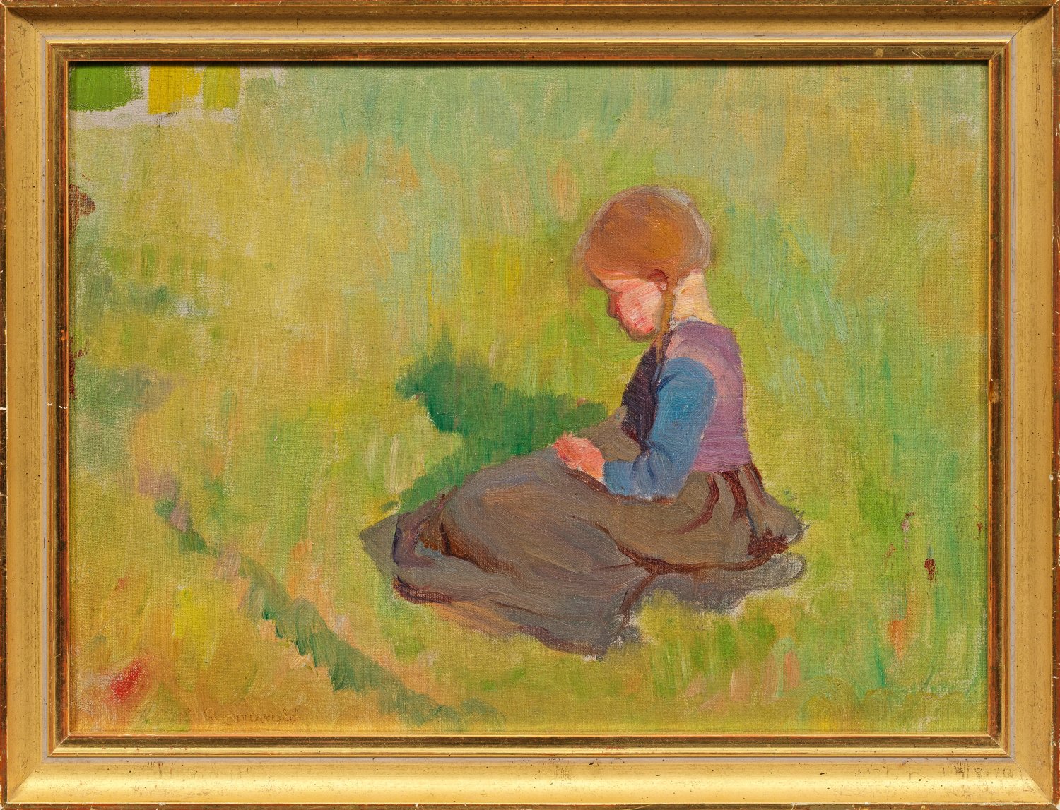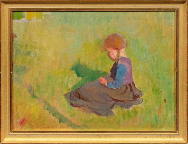 Mit breitem Duktus und heller, sommerlicher Palette gemalte Darstellung eines Mädchens, in einer Wiese sitzend. Reizvolles, impressionistisches Werk Grønvolds, der 1876 seinem Bruder nach München folgte, wo er ab 1878 Akademieschüler bei Ferdinand Löfftz wurde. Zahlreiche Studienreisen führten ihn u. a. nach Berlin, Florenz und Paris, wo er Bekanntschaft mit bedeutenden Zeitgenossen wie Lovis Corinth und Anders Zorn machte. In den 1890er zog er mit seiner Frau Hermine (Minka), die ebenfalls Malerin war, in das Sarntal nach Südtirol und konzentrierte sich fortan auf seine Tätigkeit als Sammler und Kunsthistoriker. Öl/Lwd., kaschiert auf Karton. L. u. sign.; Verso bez. mit Ortsangabe Sarntal. 24,4 cm x 32,8 cm. Rahmen.