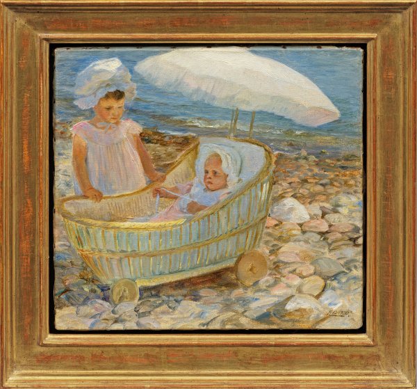Lichtdurchflutete, heitere Schilderung zweier Kleinkinder an einer steinigen Küste. In hellem, impressionistischem Kolorit gemaltes Werk Larsens, in dem der Einfluss Hans Smidths und Vilhelm Kyhns deutlich sichtbar wird. Larsen studierte an der Kopenhagener Akademie und debütierte 1887 auf der Charlottenborger Frühjahrsausstellung. Neben feinfühligen Genrebildern schuf der dänische Maler zahlreiche Landschaften, die von den unmittelbaren Eindrücken der Landschaft Jutlands geprägt sind. Öl/Lwd.; R. u. monogr. und dat. 1905. Verso auf dem Keilrahmen sign. und dat. (19)05. 27 cm x 29,3 cm. Rahmen.