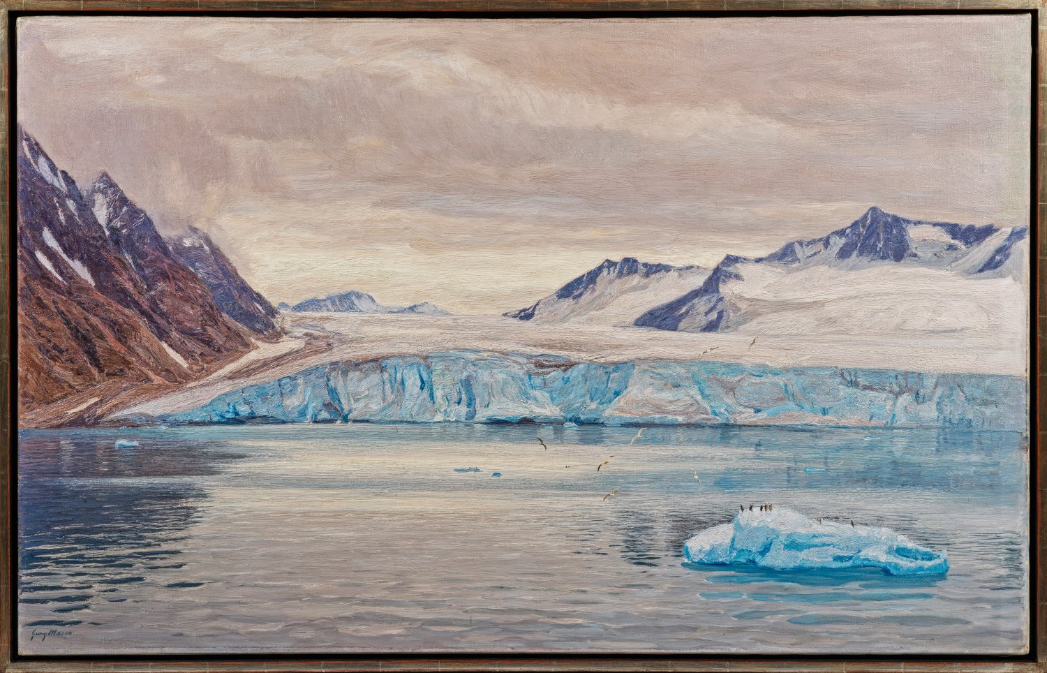 Impressionistische Landschaft mit koloristisch subtiler Erfassung des nördlichen Lichts auf dem Wasser, dem Eis und Schnee. Macco, der 1880-1887 an der Kunstakademie Düsseldorf bei Eugen Dücker und Johann Peter Theodor Janssen studierte, unternahm weite Studienreisen, die ihn außer nach Norwegen und Spitzbergen auch nach Athen, Konstantinopel sowie in den Orient und Ägypten führten. In einer größeren Werkreihe befasste sich Macco wiederholt mit den Gletschern auf Spitzbergen. Öl/Lwd.; L. u. sign.; 84 cm x 134 cm. Rahmen.