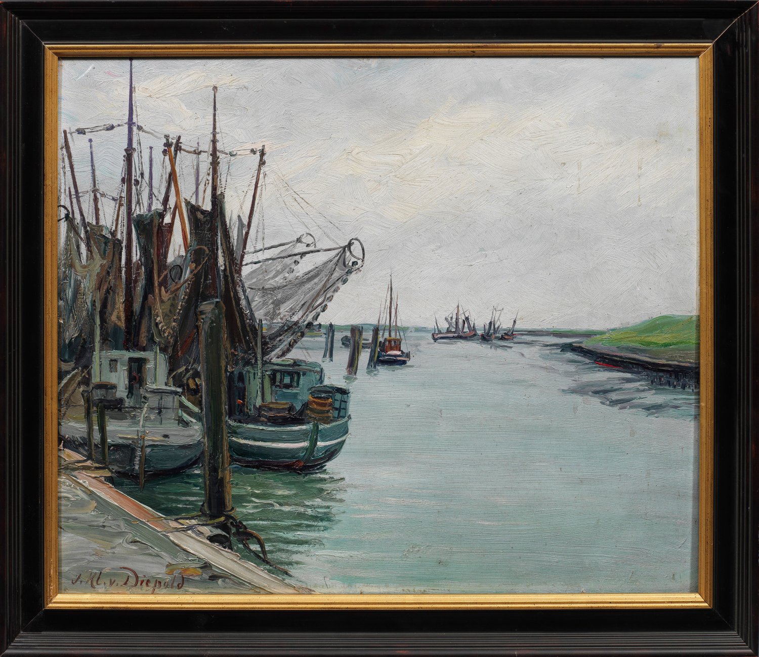 Spätimpressionistische, mit schnellem, breitem, virtuos lockerem Duktus und pastosem Farbauftrag gemaltes Motiv. Klein von Diepold kam 1919 zum ersten Mal nach Ostfriesland, wo er wenig später dauerhaft ansässig und zum bedeutenden Schilderer der dortigen Landschaft wurde. Öl/Sperrholztafel. L. u. sign.; Verso auf einem alten Etikett der Galerie Commeter, Hamburg, bez. u. betitelt. 50 cm x 60 cm. Rahmen.