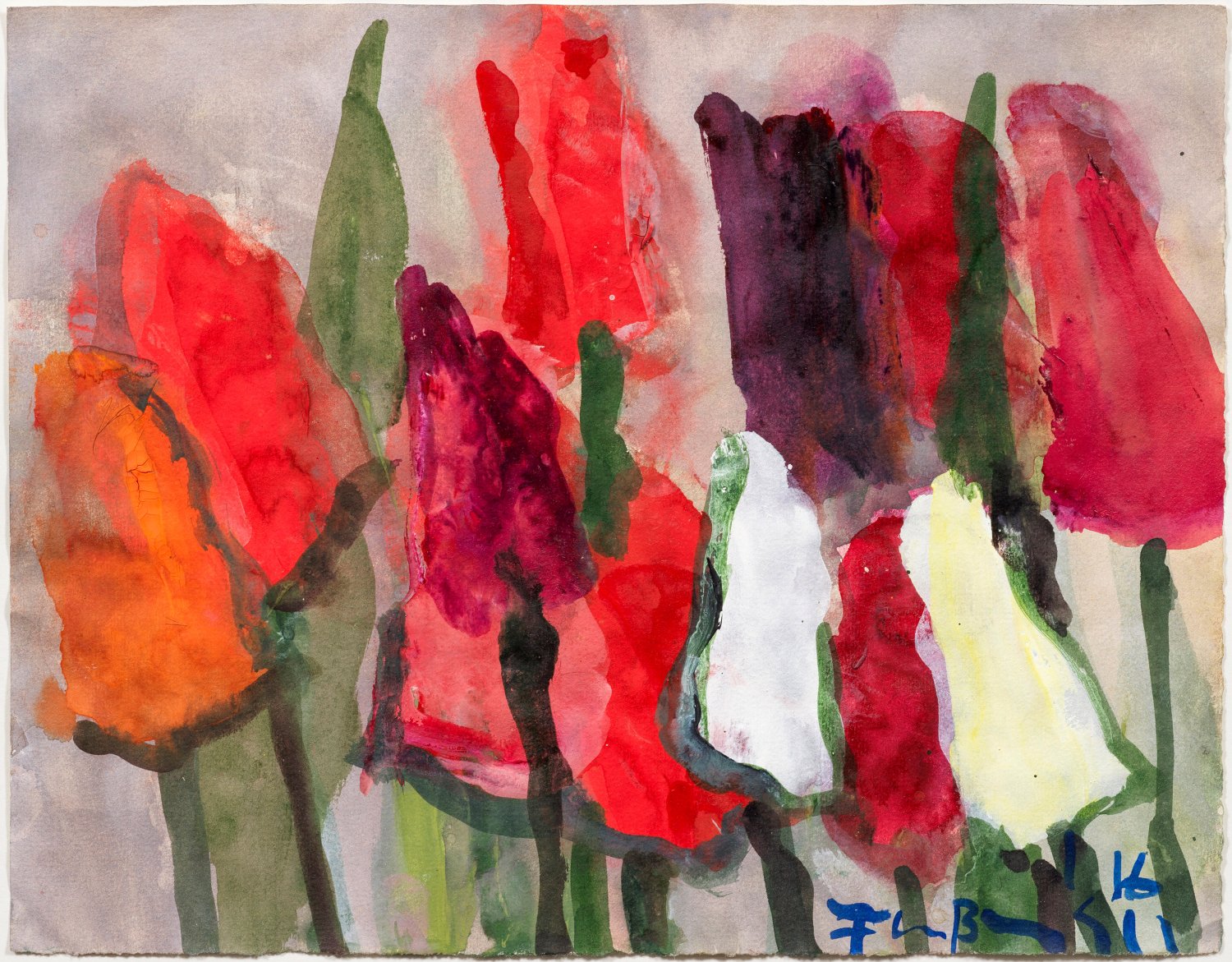 Charakteristisches, ausschnitthaft angelegtes Blatt Fußmanns, der sich intensiv mit dem Bildthema des Blumenstilllebens auseinandersetzt und ganz in der Tradition Emil Noldes, eine Vorliebe für Gartenblumen besitzt. Nach seinem Studium an der Folkwang-Schule in Essen und an der Hochschule für Bildende Künste in Berlin, erhielt Fußmann 1972 den Villa Romana-Preis und stellte in der Neuen Nationalgalerie in Berlin aus. 1974-2005 wirkte er als Professor in Berlin. Anlässlich des 70. und 80. Geburtstags wurde sein Oeuvre in umfassenden Werkschauen gezeigt, u. a. im Landesmuseum Schloss Gottorf und im Museum Barberini in Potsdam. Aquarell/Papier. R. u. sign. und dat. (20)16. 24 cm x 30 cm.