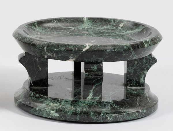 Dunkelgrüner, hellgrün und weiß gemaserter, sog. Verde Aver Marmor. Über umlaufend gekehltem Rundsockel stilisierte Volutenelemente als Träger für runde, flachgemuldete Schale. H. 13,5 cm. D. 26 cm.