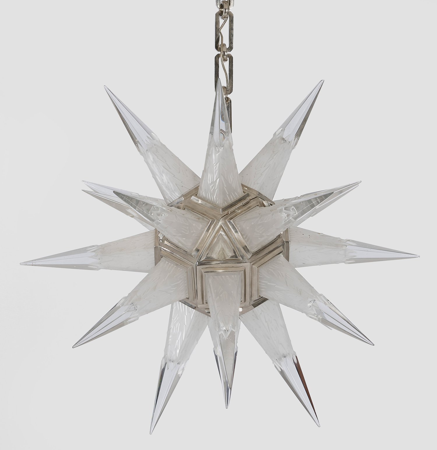 1-flg.; Metall, vernickelt sowie farbloses, teilw. satiniertes Glas. Vielfach gekanteter Korpus aus Profilstegen. Davon ausgehend unterschiedlich lange, spitz zulaufende Glaskörper in Form von Eiszapfen. Entw. um 1931. Elektrifiziert. Minim. besch.; H. 63 cm. D. 67 cm.