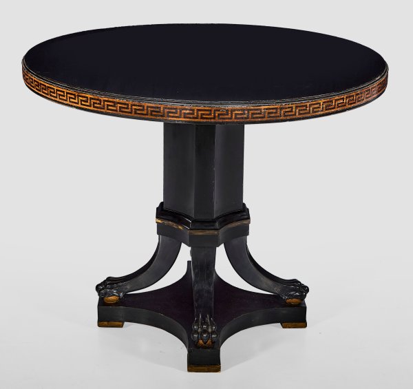 Holz, ebonisiert sowie Einlagen aus Nussbaum. Über flacher, vierseitig konkav eingezogener Sockelplatte gebogte Streben mit reliefplastischen Tatzenfüßen. Oberhalb, kräftiger, korrespondierender Schaft als Träger für runde Deckplatte mit umlaufendem Mäanderfries. H. 74,5 cm. D. 91 cm.