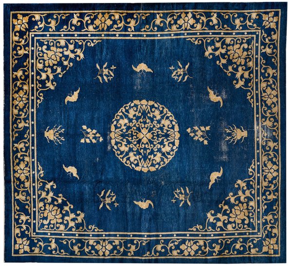 China. Um 1920-1930. Wolle auf Baumwolle. Im tintenblauen Innenfeld großes Zentralmedaillon und entsprechende Ecklösungen aus Blattranken. Lose gestreute Musterung aus Schmetterlingen und Blüten. Umlaufend breite Bordüre mit korrespondierender Musterung. Rep.; Besch.; 378 cm x 347 cm.