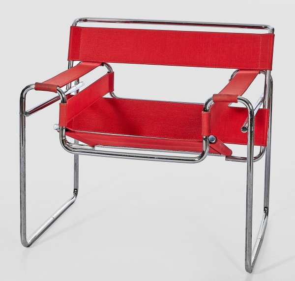 Stahlrohr, verchromt und roter Stoff. Gestell aus gebogten und ineinander verschraubten Rundstäben. Sitzfläche und Lehnen aus gespannten Stoffgurten. Am Rahmen bez. Knoll Studio Marcel Breuer. Entw. Marcel Breuer, um 1925. H. 74 cm. 77 cm x 64 cm. Sitz-H. 42 cm.
